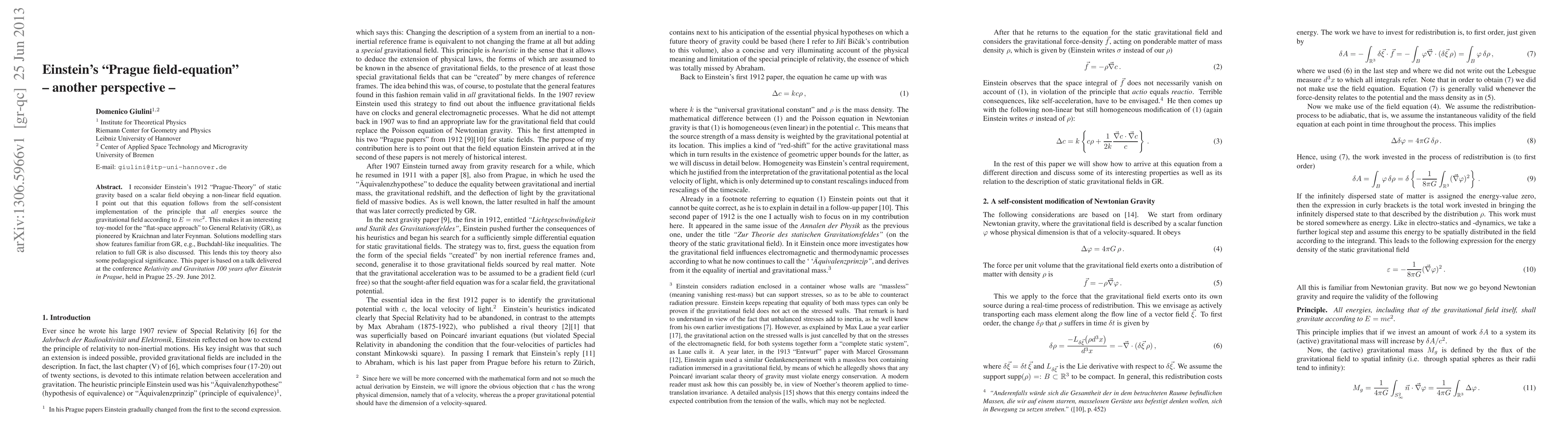 I reconsider Einstein's 1912 "Prague-Theory" of static gravity based on a scalar field obeying a non-linear field equation. I point out that this equation follows from the self-consistent implementation of the principle that all energies source the gravitational field according to E=m(c-squared). This makes it an interesting toy-model for the "flat-space approach" to General Relativity, as pioneered by Kraichnan and later Feynman. Solutions modelling stars show features familiar from GR, e.g., Buchdahl-like inequalities. The relation to full GR is also discussed. This lends this toy theory also some pedagogical significance.