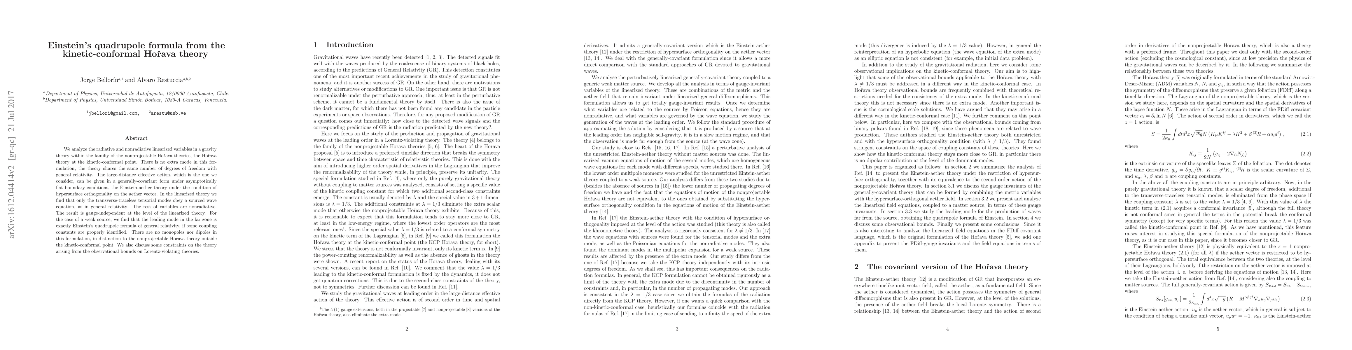This paper derives Einstein's quadrupole formula from the kinetic-conformal Horava theory, showing that it shares the same number of degrees of freedom as general relativity without introducing extra modes. The leading mode in the far zone matches general relativity's predictions for weak sources.