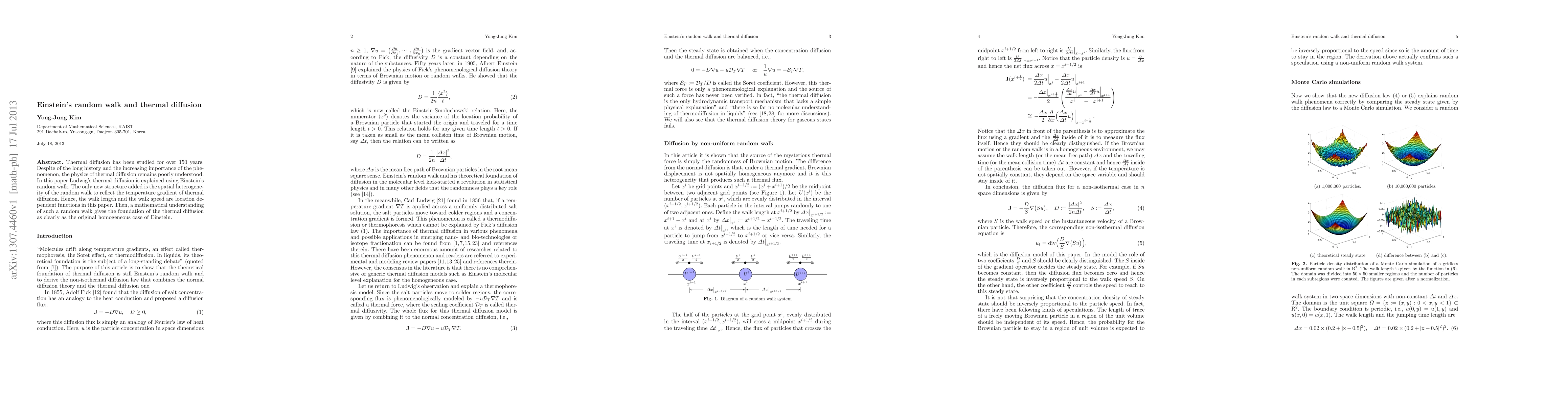 Thermal diffusion has been studied for over 150 years. Despite of the long history and the increasing importance of the phenomenon, the physics of thermal diffusion remains poorly understood. In this paper Ludwig's thermal diffusion is explained using Einstein's random walk. The only new structure added is the spatial heterogeneity of the random walk to reflect the temperature gradient of thermal diffusion. Hence, the walk length and the walk speed are location dependent functions in this paper. Then, a mathematical understanding of such a random walk gives the foundation of the thermal diffusion as clearly as the original homogeneous case of Einstein.