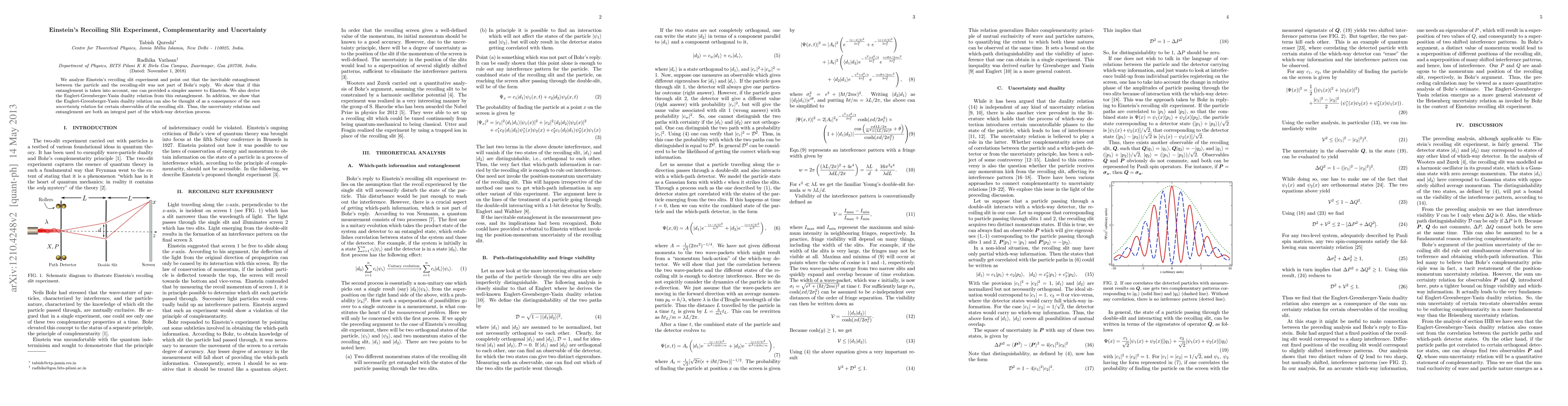 This paper analyzes Einstein's recoiling slit experiment, revealing that the entanglement between the particle and the recoiling slit, overlooked in Bohr's original response, simplifies the explanation. It derives the Englert-Greenberger-Yasin duality relation from this entanglement and shows it as a consequence of the sum uncertainty relation for certain observables of the recoiling slit.