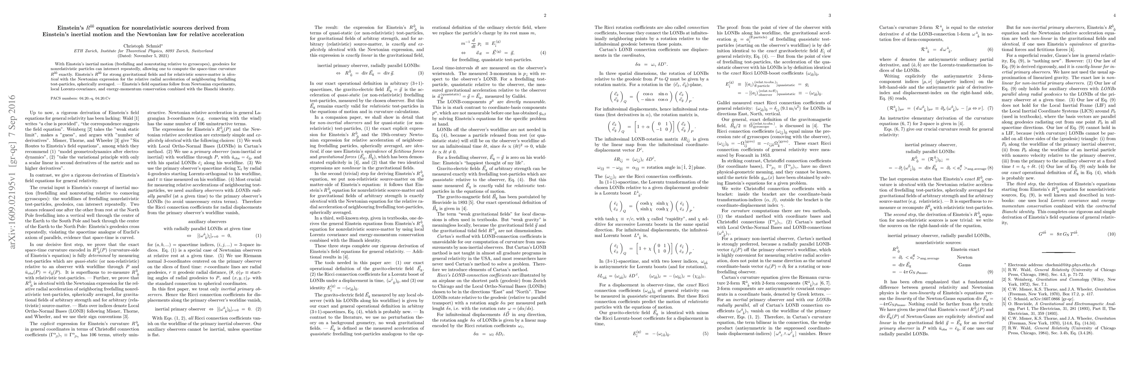 This paper derives Einstein's $R^{\hat{0} \hat{0}}$ equation for non-relativistic sources using Einstein's inertial motion and the Newtonian law for relative acceleration, showing that geodesics for non-relativistic particles can intersect, allowing exact computation of space-time curvature. The derived equation aligns with the Newtonian expression for relative radial acceleration of test-particles.
