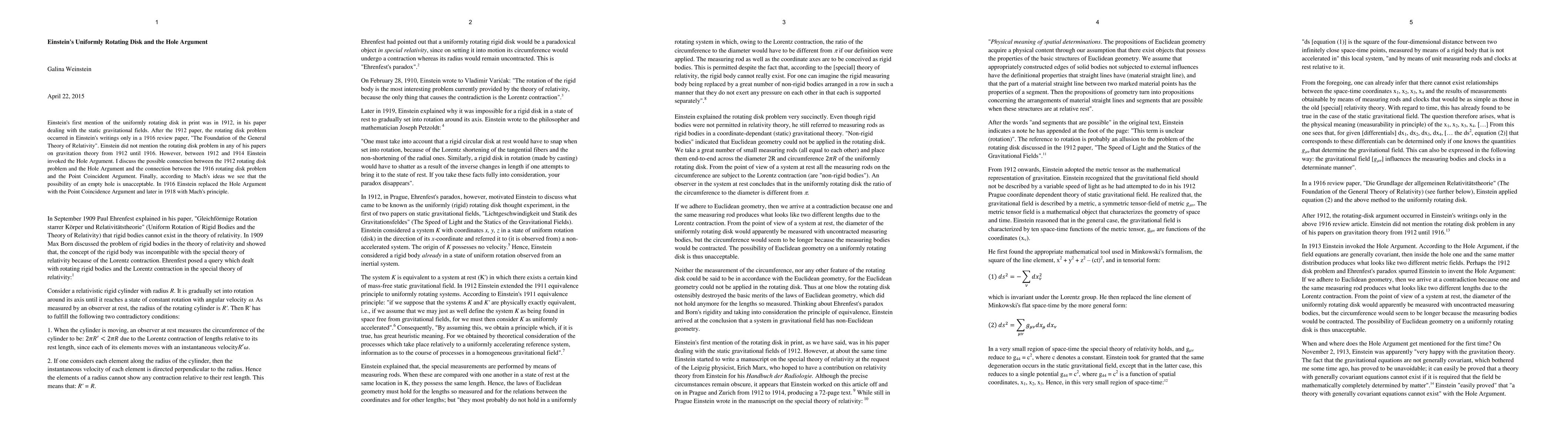 Einstein's first mention of the uniformly rotating disk in print was in 1912, in his paper dealing with the static gravitational fields. After the 1912 paper, the rotating disk problem occurred in Einstein's writings only in a 1916 review paper, "The Foundation of the General Theory of Relativity". Einstein did not mention the rotating disk problem in any of his papers on gravitation theory from 1912 until 1916. However, between 1912 and 1914 Einstein invoked the Hole Argument. I discuss the possible connection between the 1912 rotating disk problem and the Hole Argument and the connection between the 1916 rotating disk problem and the Point Coincident Argument. Finally, according to Mach's ideas we see that the possibility of an empty hole is unacceptable. In 1916 Einstein replaced the Hole Argument with the Point Coincidence Argument and later in 1918 with Mach's principle.