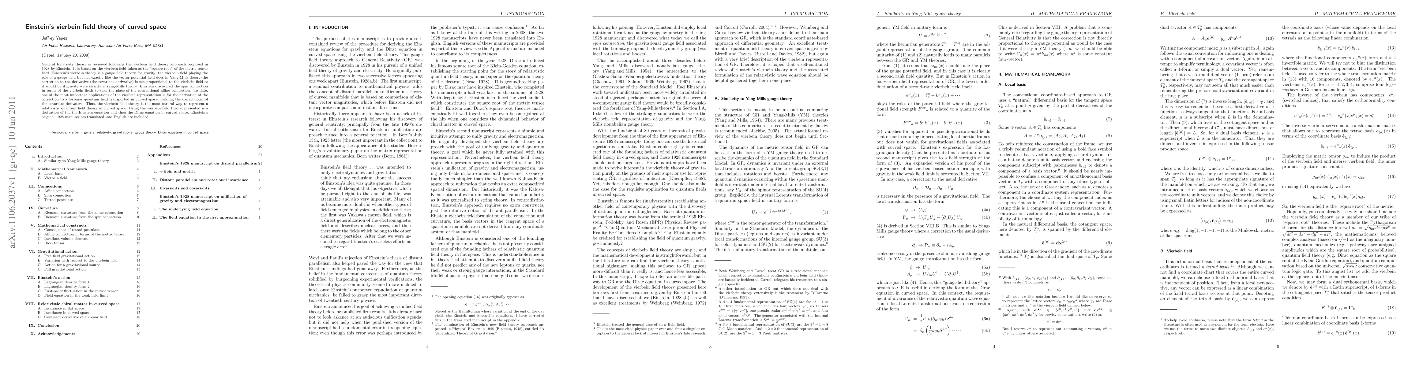 General Relativity theory is reviewed following the vierbein field theory approach proposed in 1928 by Einstein. It is based on the vierbein field taken as the "square root" of the metric tensor field. Einstein's vierbein theory is a gauge field theory for gravity; the vierbein field playing the role of a gauge field but not exactly like the vector potential field does in Yang-Mills theory--the correction to the derivative (the covariant derivative) is not proportional to the vierbein field as it would be if gravity were strictly a Yang-Mills theory. Einstein discovered the spin connection in terms of the vierbein fields to take the place of the conventional affine connection. To date, one of the most important applications of the vierbein representation is for the derivation of the correction to a 4-spinor quantum field transported in curved space, yielding the correct form of the covariant derivative. Thus, the vierbein field theory is the most natural way to represent a relativistic quantum field theory in curved space. Using the vierbein field theory, presented is a derivation of the the Einstein equation and then the Dirac equation in curved space. Einstein's original 1928 manuscripts translated into English are included.