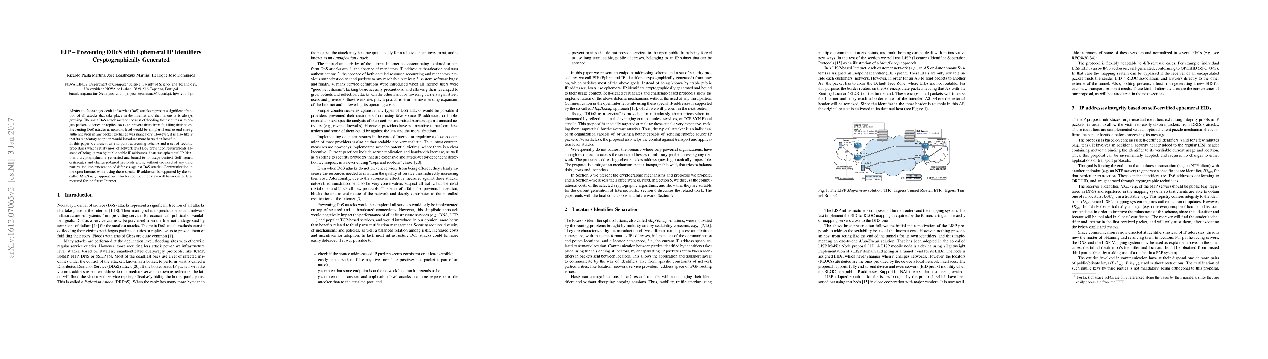 This paper proposes a method to prevent DDoS attacks using ephemeral IP identifiers cryptographically generated and self-signed certificates, enabling host-level authentication without relying on third parties.