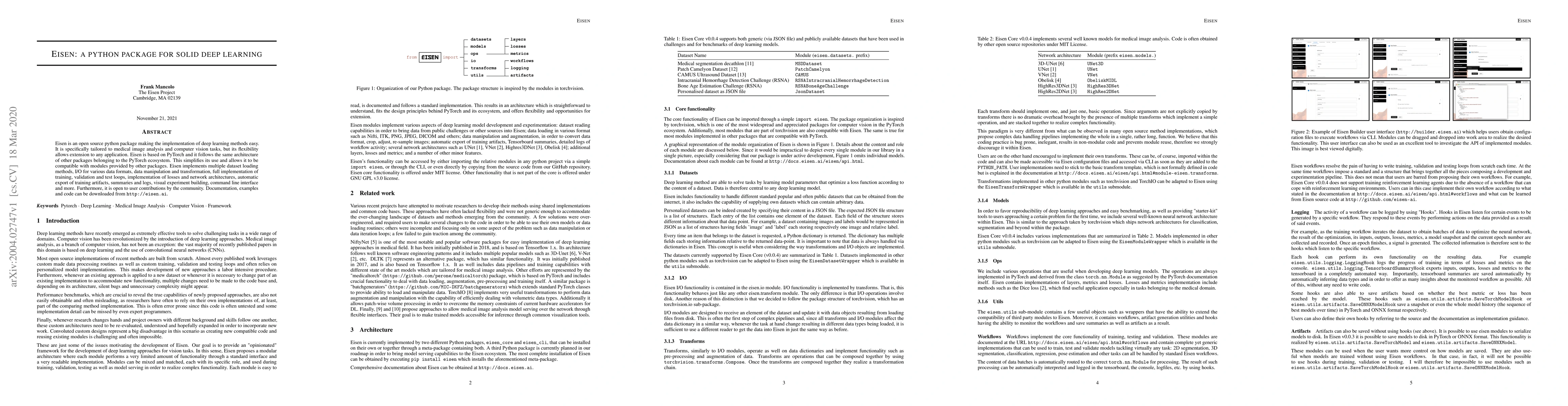 Eisen is an open-source Python package designed to simplify deep learning implementation, particularly for medical image analysis and computer vision, with compatibility and extensions to other applications. It offers comprehensive tools for dataset handling, training, and visualization, and encourages community contributions.