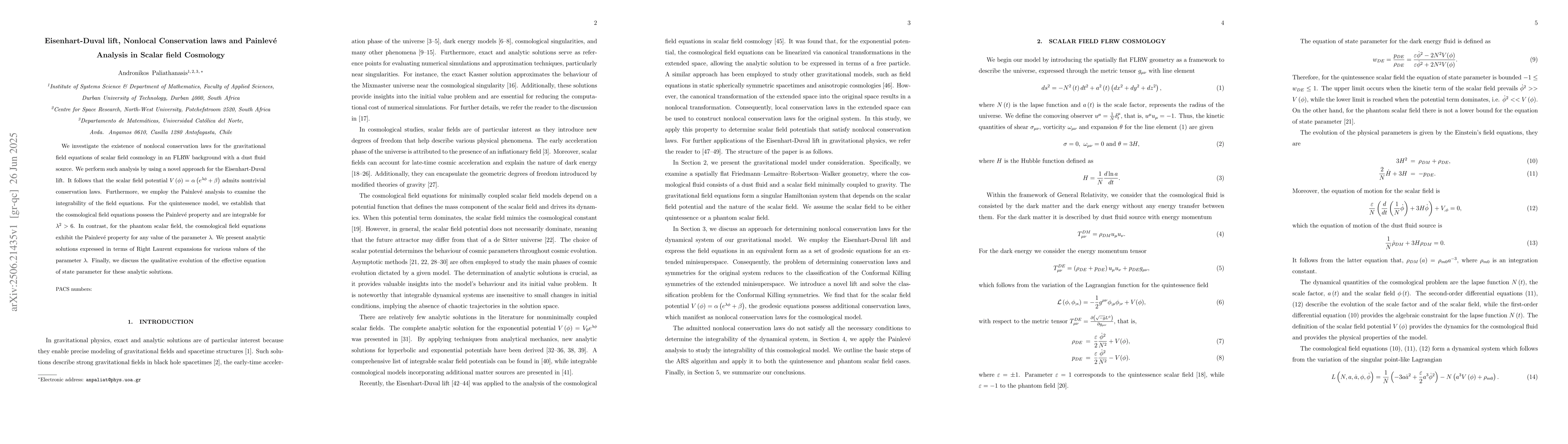 The paper introduces a novel application of the Eisenhart-Duval lift combined with Painlevé analysis to assess the integrability of scalar field cosmological equations, establishing conditions for conservation laws and exact solutions.