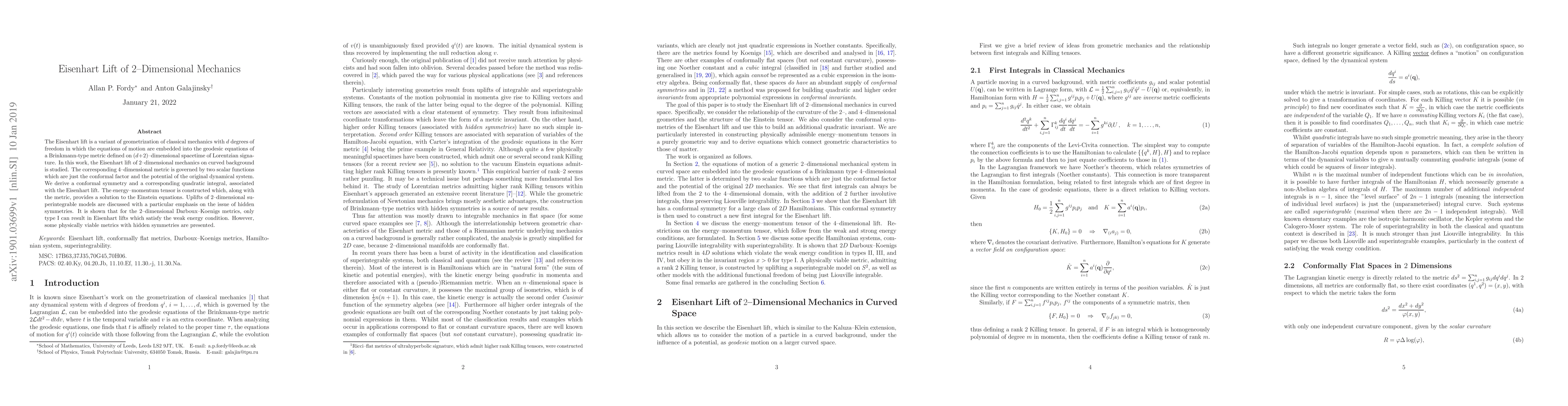 The paper derives a conformal symmetry and an associated quadratic integral for the Eisenhart lift of 2-dimensional mechanics, constructs an energy-momentum tensor satisfying the Einstein equations, and discusses uplifts of 2-dimensional superintegrable models, highlighting physically viable metrics with hidden symmetries.