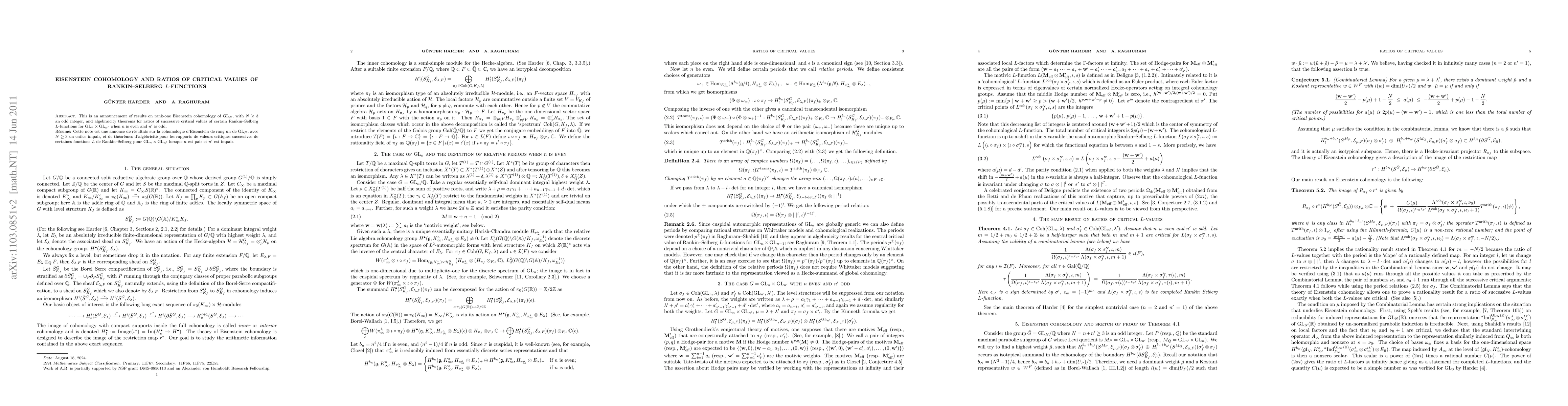 Summary: The paper announces findings on rank-one Eisenstein cohomology for GL(N) with N an odd integer, and presents algebraicity theorems for ratios of critical values of Rankin-Selberg L-functions for GL(n) x GL(n') when n is even and n' is odd.