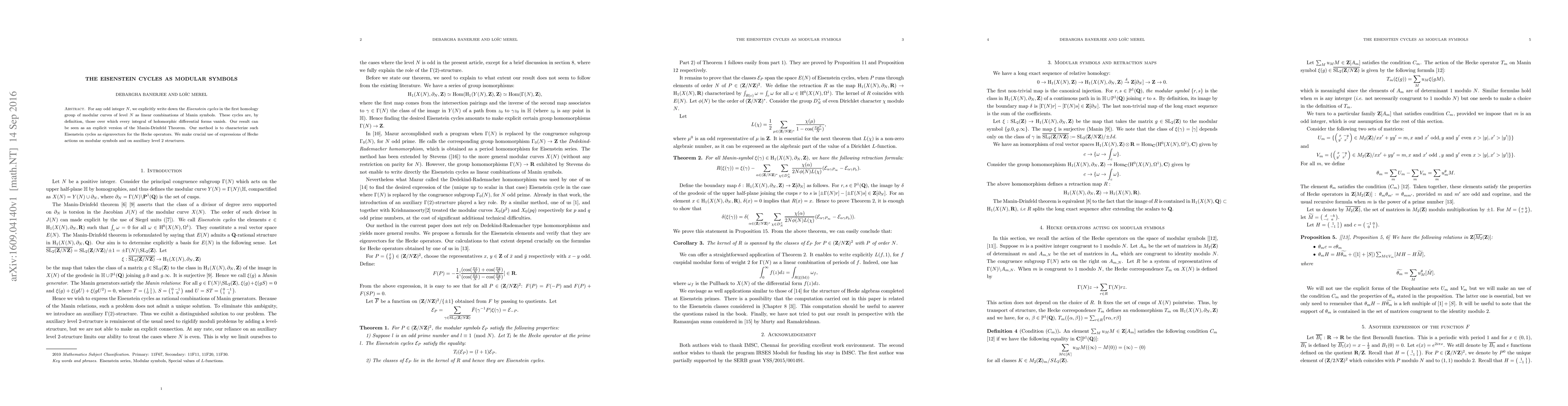 Summary: The paper explicitly expresses Eisenstein cycles in modular curves' first homology as linear combinations of Manin symbols, confirming a version of the Manin-Drinfeld Theorem. The method identifies these cycles as eigenvectors for Hecke operators, leveraging specific actions of Hecke operators on modular symbols and level 2 structures.