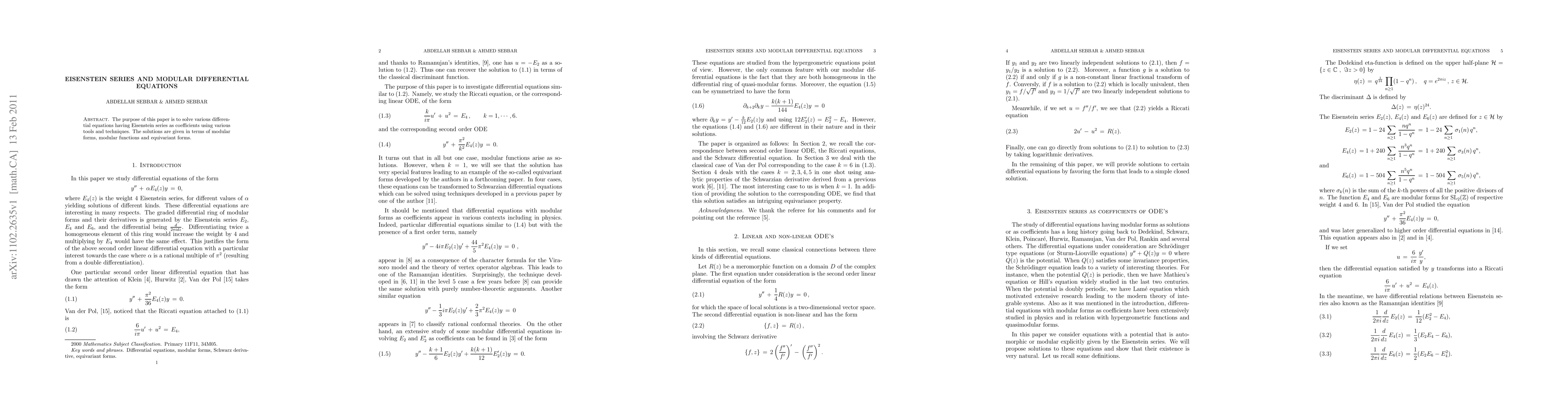 This paper explores the solution of differential equations with Eisenstein series coefficients, employing advanced techniques to express the solutions in terms of modular forms, modular functions, and equivariant forms. The study bridges differential equations and modular forms through innovative mathematical methods.