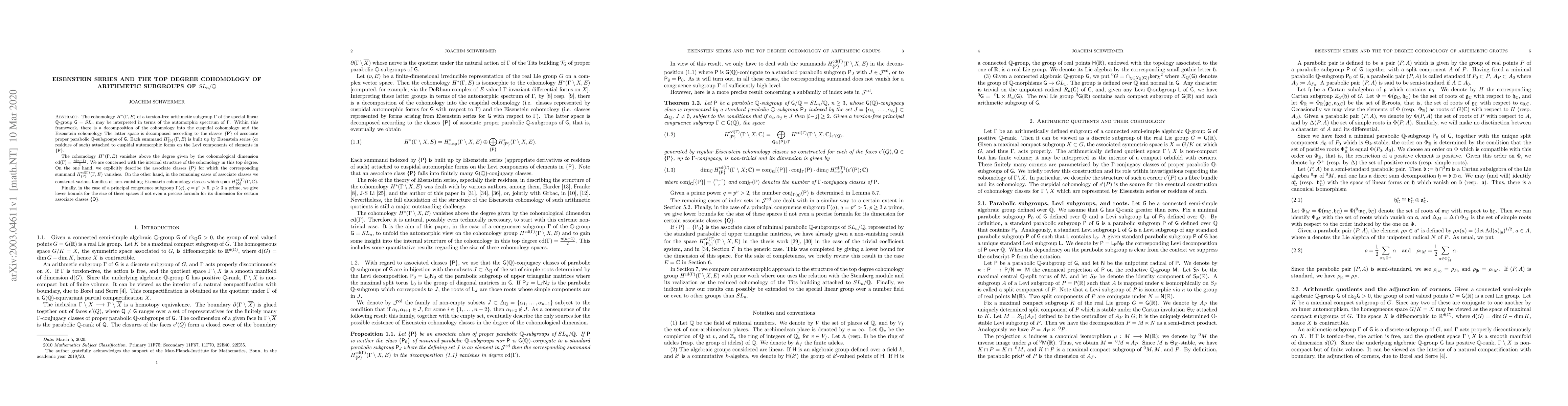 This paper studies the top degree cohomology of arithmetic subgroups of $SL_n/\mathbb{Q}$ and decomposes it into cuspidal and Eisenstein components. It identifies classes for which the Eisenstein component vanishes and constructs families of non-vanishing Eisenstein cohomology classes in the remaining cases, providing lower bounds for their dimensions for principal congruence subgroups.