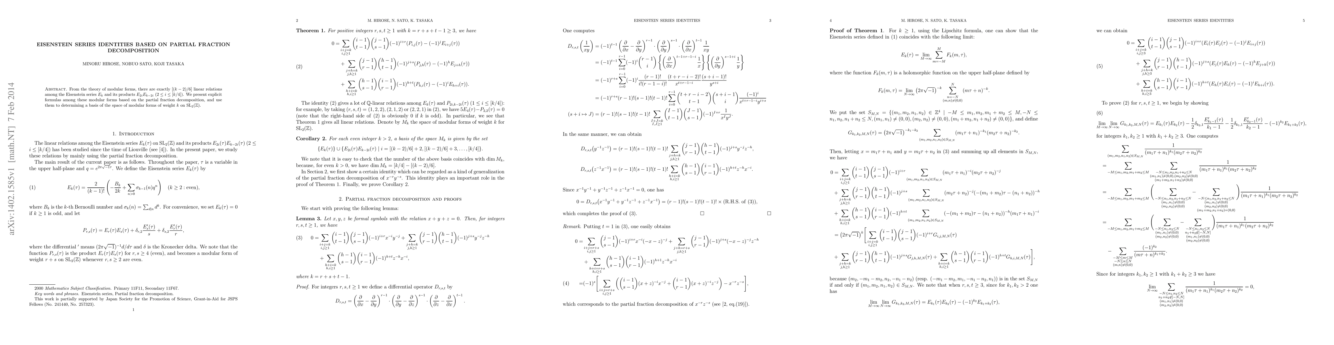 The paper presents explicit formulas for linear relations among Eisenstein series based on partial fraction decomposition, leading to a basis of modular forms of weight k on SL2(Z).