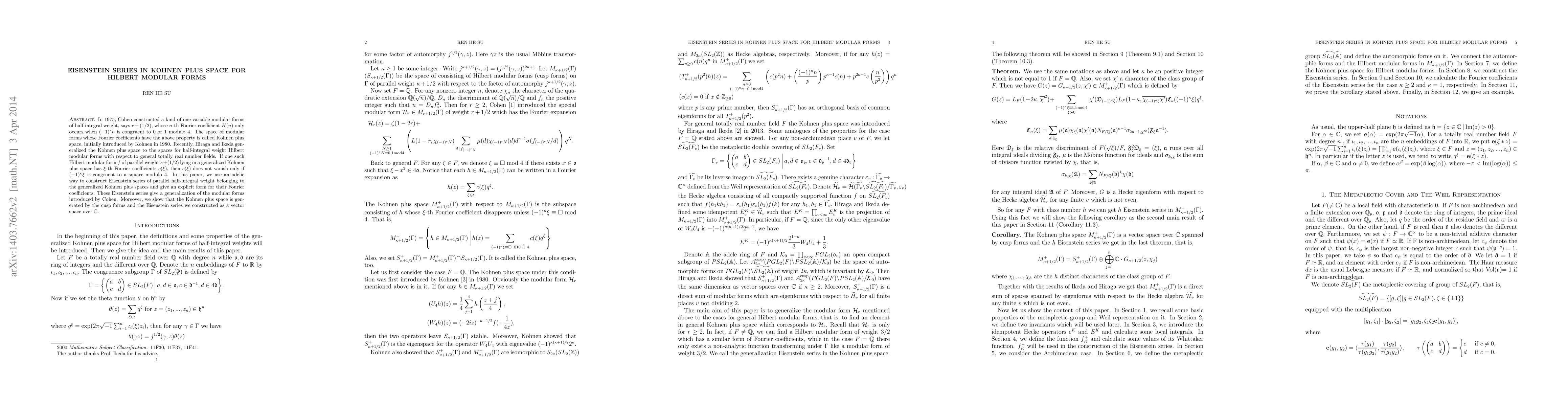 In 1975, Cohen constructed a kind of one-variable modular forms of half-integral weight, says $r+(1/2),$ whose $n$-th Fourier coefficient $H(n)$ only occurs when $(-1)^r n$ is congruent to 0 or 1 modulo 4. The space of modular forms whose Fourier coefficients have the above property is called Kohnen plus space, initially introduced by Kohnen in 1980. Recently, Hiraga and Ikeda generalized the Kohnen plus space to the spaces for half-integral weight Hilbert modular forms with respect to general totally real number fields. If one such Hilbert modular form $f$ of parallel weight $\kappa+(1/2)$ lying in a generalized Kohnen plus space has $\xi$-th Fourier coefficients $c(\xi)$, then $c(\xi)$ does not vanish only if $(-1)^\kappa\xi$ is congruent to a square modulo 4. In this paper, we use an adelic way to construct Eisenstein series of parallel half-integral weight belonging to the generalized Kohnen plus spaces and give an explicit form for their Fourier coefficients. These Eisenstein series give a generalization of the modular forms introduced by Cohen. Moreover, we show that the Kohnen plus space is generated by the cusp forms and the Eisenstein series we constructed as a vector space over $\mathbb{C}.$