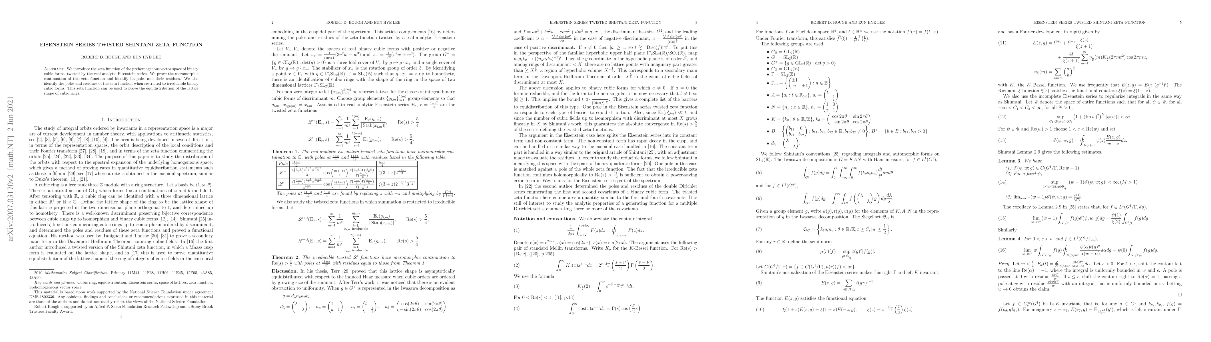 This paper introduces a zeta function for binary cubic forms, twisted by an Eisenstein series, proving its meromorphic continuation and identifying its poles and residues. It also applies this to demonstrate the equidistribution of cubic rings' lattice shapes.