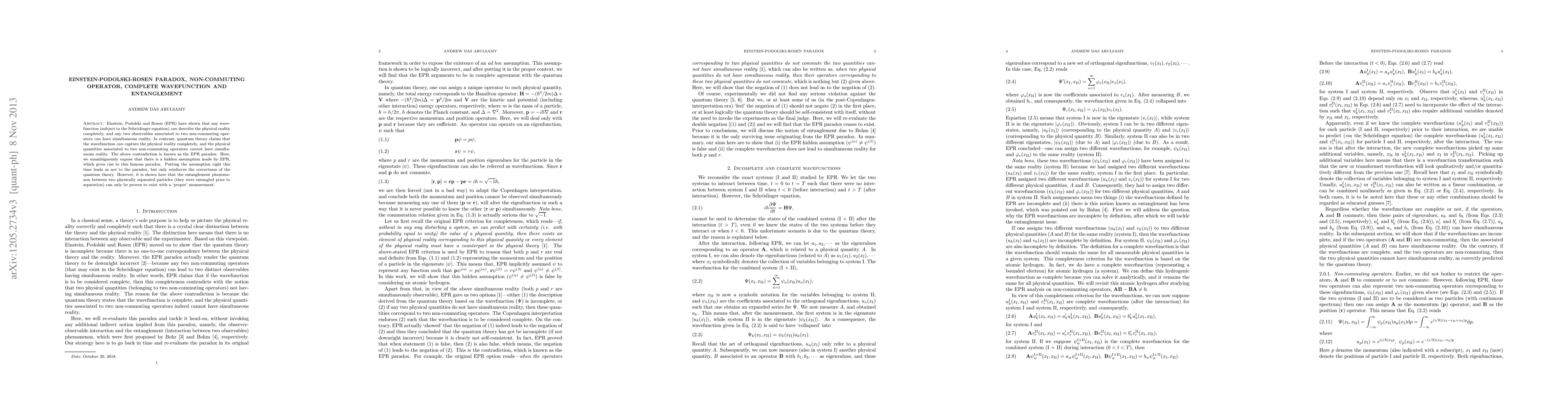 Einstein, Podolski and Rosen (EPR) have shown that any wave function (subject to the Schr\"odinger equation) can describe the physical reality completely, and any two observables associated to two non-commuting operators can have simultaneous reality. In contrast, quantum theory claims that the wave function can capture the physical reality completely, and the physical quantities associated to two non-commuting operators cannot have simultaneous reality. The above contradiction is known as the EPR paradox. Here, we unambiguously expose that there is a hidden assumption made by EPR, which gives rise to this famous paradox. Putting the assumption right this time leads us not to the paradox, but only reinforces the correctness of the quantum theory. However, it is shown here that the entanglement phenomenon between two physically separated particles (they were entangled prior to separation) can only be proven to exist with a "proper" measurement.