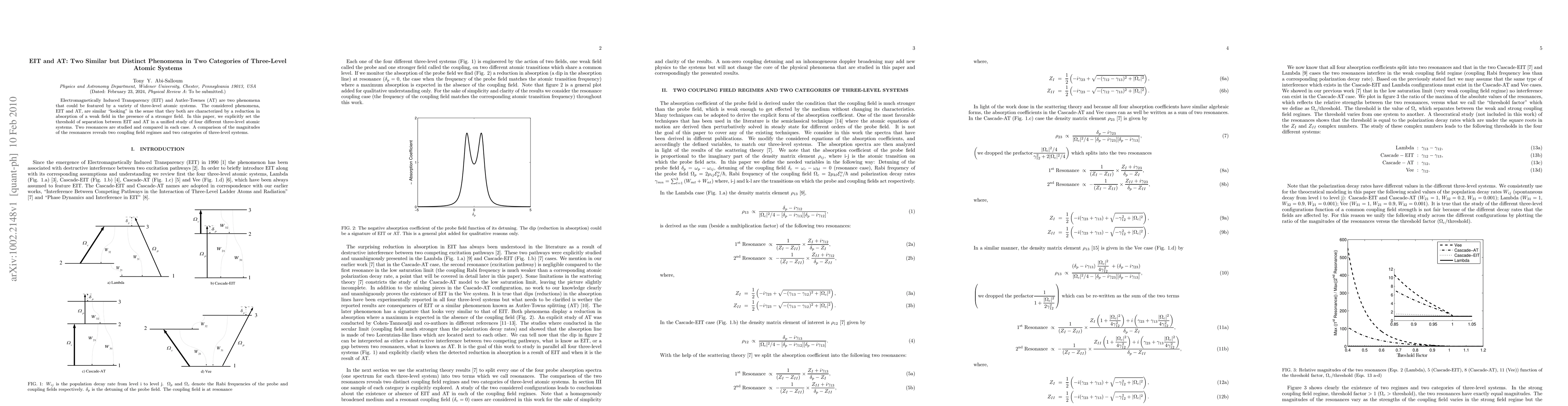 Electromagnetically Induced Transparency (EIT) and Autler-Townes (AT) are two phenomena that could be featured by a variety of three-level atomic systems. The considered phenomena, EIT and AT, are similar "looking" in the sense that they both are characterized by a reduction in absorption of a weak field in the presence of a stronger field. In this paper, we explicitly set the threshold of separation between EIT and AT in a unified study of four different three-level atomic systems. Two resonances are studied and compared in each case. A comparison of the magnitudes of the resonances reveals two coupling field regimes and two categories of three-level systems.