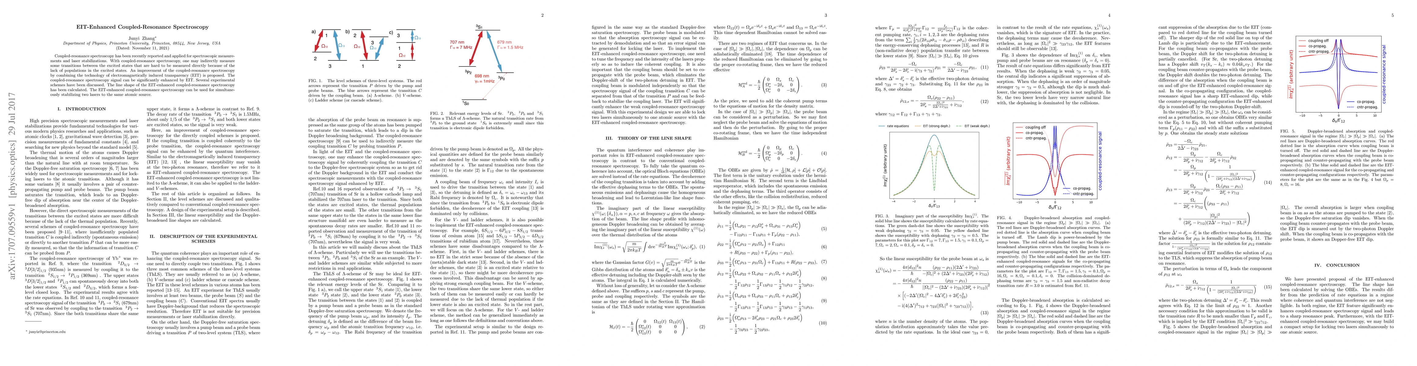 This paper proposes an enhancement of coupled-resonance spectroscopy using electromagnetically induced transparency (EIT) to significantly boost signal detection, enabling indirect measurement of difficult transitions. The method can stabilize two lasers simultaneously with the same atomic source.
