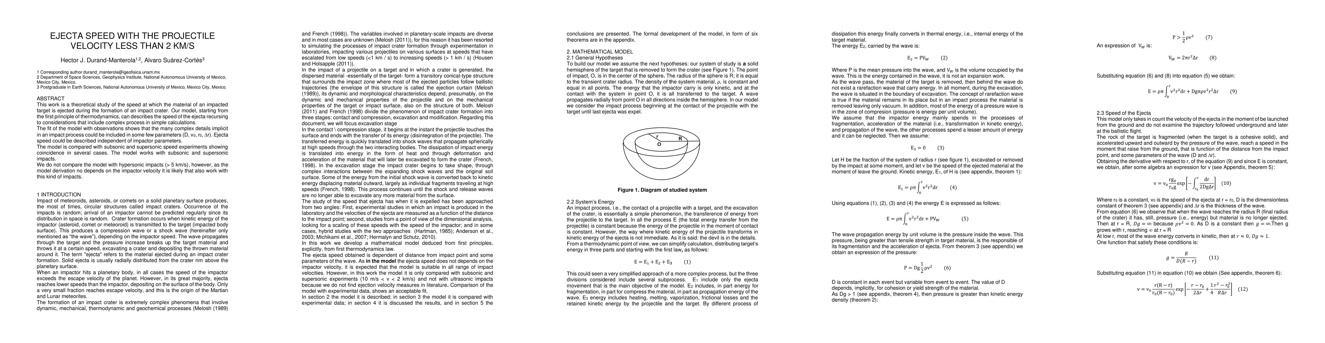 This research paper presents a theoretical model that describes the speed of ejecta in impact craters without relying on specific impactor parameters, with successful comparisons to subsonic and supersonic experiments.