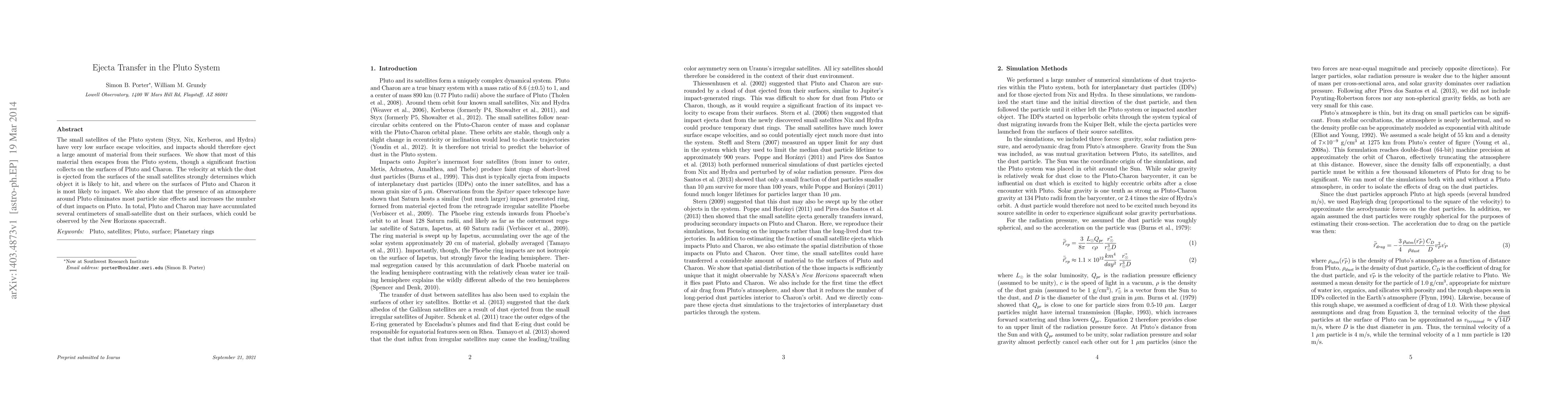 This paper investigates ejecta transfer in the Pluto system, demonstrating that impacts on small satellites eject significant material, much of which accumulates on Pluto and Charon. The presence of Pluto's atmosphere enhances dust impacts on Pluto, potentially adding several centimeters of small-satellite dust to their surfaces, observable by the New Horizons spacecraft.