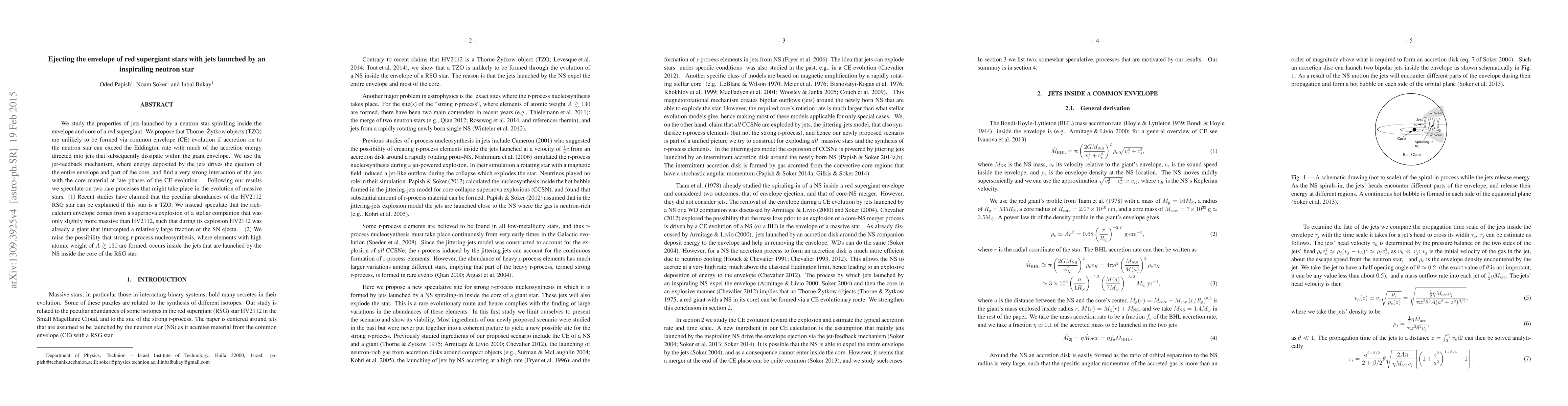 We study the properties of jets launched by a neutron star spiralling inside the envelope and core of a red supergiant. We propose that Thorne-Zytkow objects (TZO) are unlikely to be formed via common envelope (CE) evolution if accretion on to the neutron star can exceed the Eddington rate with much of the accretion energy directed into jets that subsequently dissipate within the giant envelope. We use the jet-feedback mechanism, where energy deposited by the jets drives the ejection of the entire envelope and part of the core, and find a very strong interaction of the jets with the core material at late phases of the CE evolution. Following our results we speculate on two rare processes that might take place in the evolution of massive stars. (1) Recent studies have claimed that the peculiar abundances of the HV2112 RSG star can be explained if this star is a TZO. We instead speculate that the rich-calcium envelope comes from a supernova explosion of a stellar companion that was only slightly more massive than HV2112, such that during its explosion HV2112 was already a giant that intercepted a relatively large fraction of the SN ejecta. (2) We raise the possibility that strong r-process nucleosynthesis, where elements with high atomic weight of $A \ga 130$ are formed, occurs inside the jets that are launched by the NS inside the core of the RSG star.