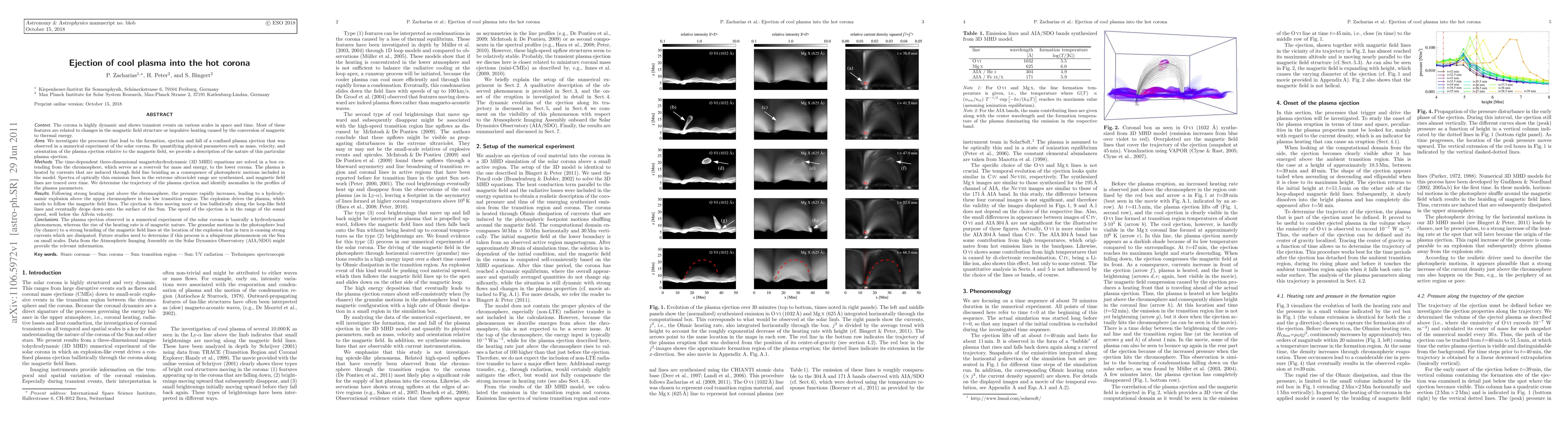 We investigate the processes that lead to the formation, ejection and fall of a confined plasma ejection that was observed in a numerical experiment of the solar corona. By quantifying physical parameters such as mass, velocity, and orientation of the plasma ejection relative to the magnetic field, we provide a description of the nature of this particular phenomenon. The time-dependent three-dimensional magnetohydrodynamic (3D MHD) equations are solved in a box extending from the chromosphere to the lower corona. The plasma is heated by currents that are induced through field line braiding as a consequence of photospheric motions. Spectra of optically thin emission lines in the extreme ultraviolet range are synthesized, and magnetic field lines are traced over time. Following strong heating just above the chromosphere, the pressure rapidly increases, leading to a hydrodynamic explosion above the upper chromosphere in the low transition region. The explosion drives the plasma, which needs to follow the magnetic field lines. The ejection is then moving more or less ballistically along the loop-like field lines and eventually drops down onto the surface of the Sun. The speed of the ejection is in the range of the sound speed, well below the Alfven velocity. The plasma ejection is basically a hydrodynamic phenomenon, whereas the rise of the heating rate is of magnetic nature. The granular motions in the photosphere lead (by chance) to a strong braiding of the magnetic field lines at the location of the explosion that in turn is causing strong currents which are dissipated. Future studies need to determine if this process is a ubiquitous phenomenon on the Sun on small scales. Data from the Atmospheric Imaging Assembly on the Solar Dynamics Observatory (AIA/SDO) might provide the relevant information.