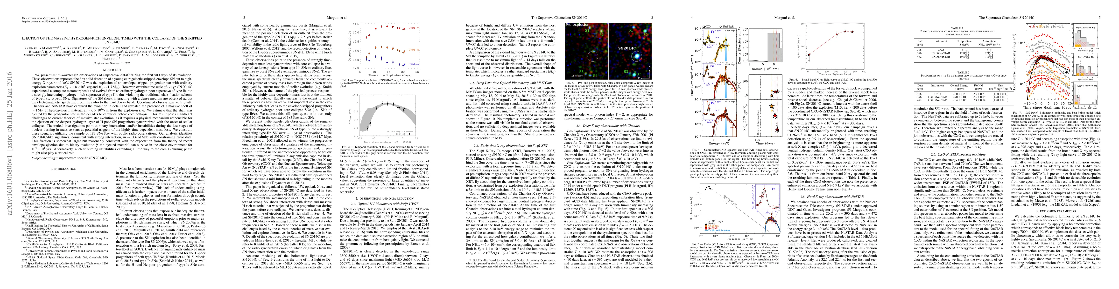 We present multi-wavelength observations of SN2014C during the first 500 days. These observations represent the first solid detection of a young extragalactic stripped-envelope SN out to high-energy X-rays. SN2014C was the explosion of an H-stripped progenitor star with ordinary explosion parameters. However, over the time scale of ~1yr, SN2014C experienced a complete metamorphosis and evolved from an ordinary H-poor supernova of type Ib into a strongly interacting, H-rich supernova of type IIn. Signatures of the SN shock interacting with a dense medium are observed across the spectrum. Coordinated observations with Swift, Chandra and NuSTAR have captured the evolution in detail and revealed the presence of a massive shell of ~1 Msun of hydrogen-rich material at ~6d16 cm from the explosion site. We estimate that the shell was ejected by the progenitor star in the decades to centuries before core collapse. This result poses significant challenges to current theories of massive star evolution, as it requires a physical mechanism responsible for the ejection of the deepest hydrogen layer of H-poor SN progenitors synchronized with the onset of stellar collapse. Theoretical investigations point at binary interactions and/or instabilities during the last stages of nuclear burning in massive stars as potential triggers of the time-dependent mass loss. We constrain these scenarios utilizing the sample of 183 SNe Ib/c with public radio observations. Our analysis identifies SN2014C-like signatures in ~10% of SNe with constraining radio data. This fraction is somewhat larger but reasonably consistent with the expectation from the theory of recent envelope ejection due to binary evolution IF the ejected material can survive in the close environment for 1000-10000 yrs. Alternatively, nuclear burning instabilities extending all the way to the core C-burning phase might also play a critical role.