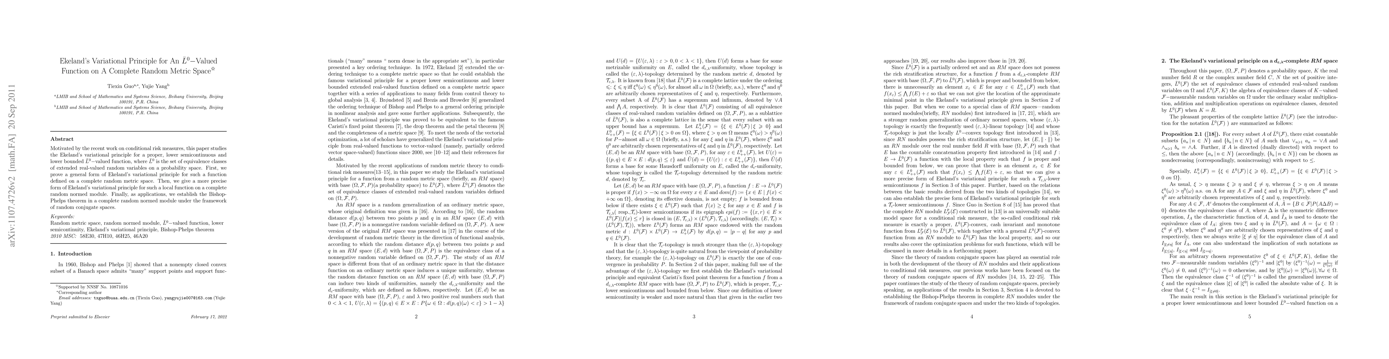 Motivated by the recent work on conditional risk measures, this paper studies the Ekeland's variational principle for a proper, lower semicontinuous and lower bounded $\bar{L}^{0}-$valued function, where $\bar{L}^{0}$ is the set of equivalence classes of extended real-valued random variables on a probability space. First, we prove a general form of Ekeland's variational principle for such a function defined on a complete random metric space. Then, we give a more precise form of Ekeland's variational principle for such a local function on a complete random normed module. Finally, as applications, we establish the Bishop-Phelps theorem in a complete random normed module under the framework of random conjugate spaces.