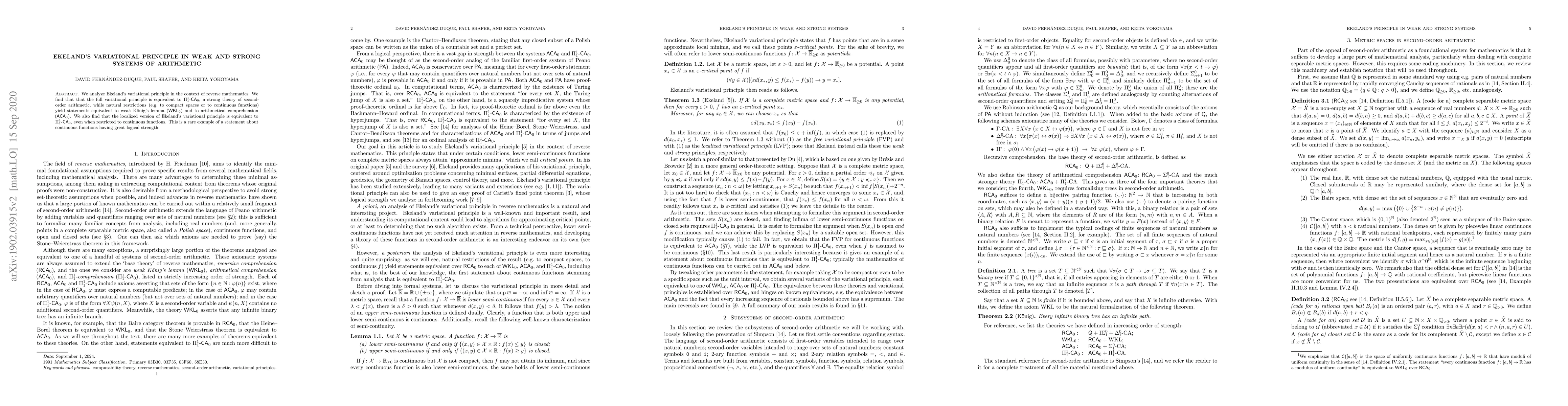 We analyze Ekeland's variational principle in the context of reverse mathematics. We find that that the full variational principle is equivalent to $\Pi^1_1$-${\sf CA}_0$, a strong theory of second-order arithmetic, while natural restrictions (e.g.~to compact spaces or continuous functions) yield statements equivalent to weak K\"onig's lemma (${\sf WKL}_0$) and to arithmetical comprehension (${\sf ACA}_0$). We also find that the localized version of Ekeland's variational principle is equivalent to $\Pi^1_1$-${\sf CA}_0$ even when restricting to continuous functions. This is a rare example of a statement about continuous functions having great logical strength.
