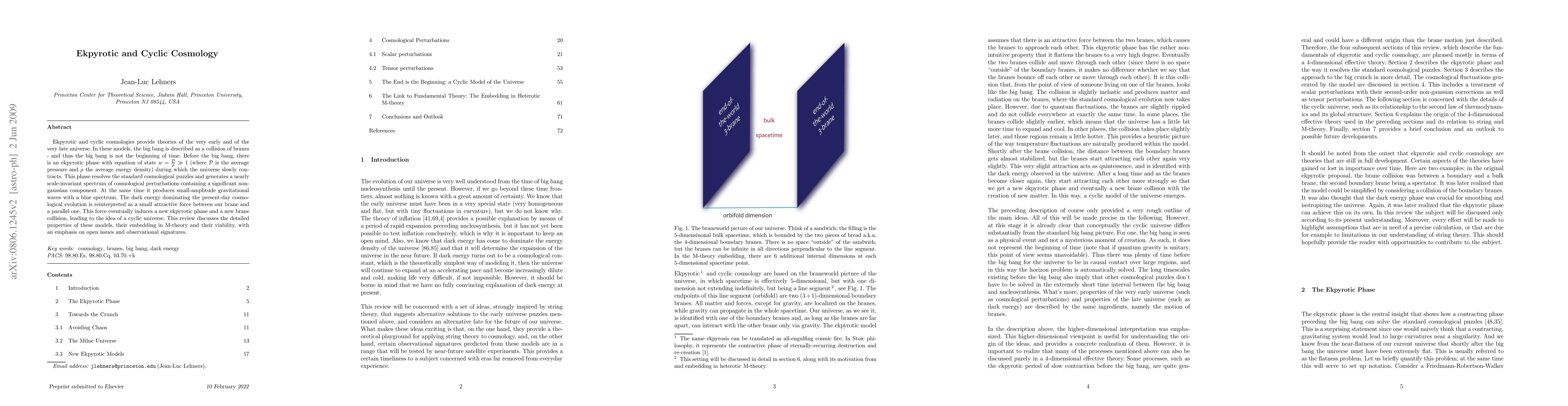 This paper explores ekpyrotic and cyclic cosmology models where the big bang results from brane collisions, replacing the traditional notion of a universe beginning with the big bang. It discusses the ekpyrotic phase, its resolution of cosmological puzzles, and the cyclic nature of the universe driven by dark energy forces.