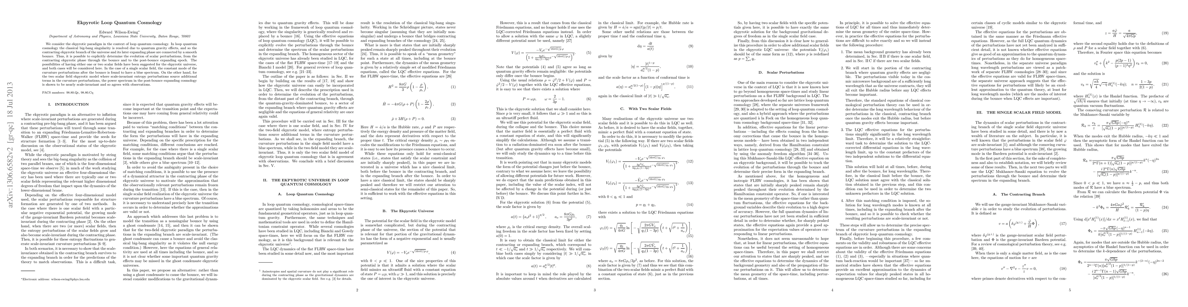This paper explores the ekpyrotic model within loop quantum cosmology, resolving the big-bang singularity through a smooth bounce. It investigates scalar perturbations in both single and two scalar field scenarios, finding a blue spectrum for the former and a nearly scale-invariant spectrum for the latter, which aligns with observational data.