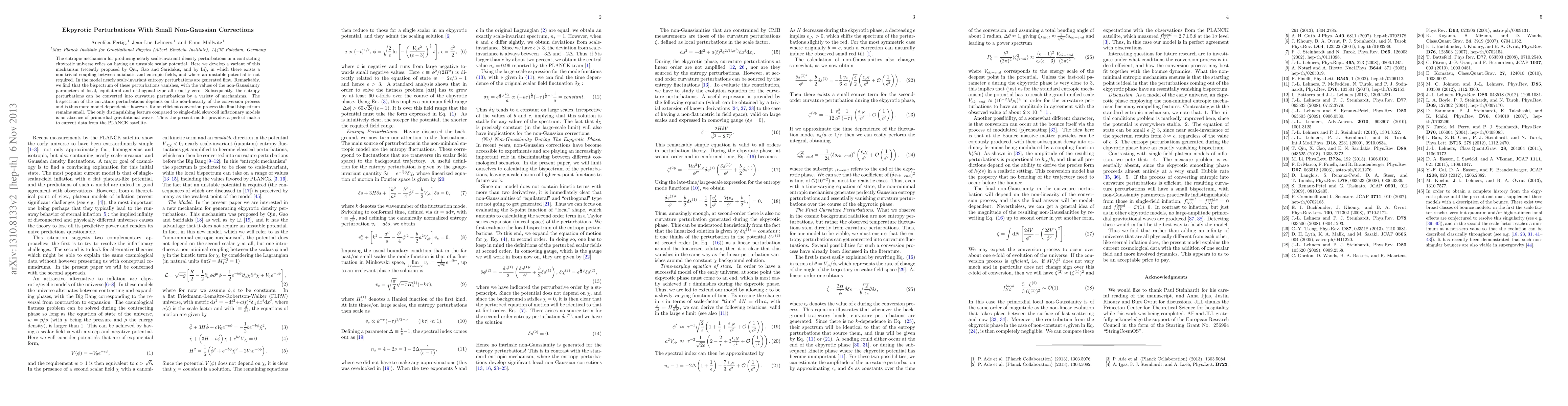 This paper explores an ekpyrotic model generating nearly scale-invariant density perturbations without requiring an unstable scalar potential, showing zero non-Gaussianity parameters and a small bispectrum, matching PLANCK satellite data, and lacking primordial gravitational waves.