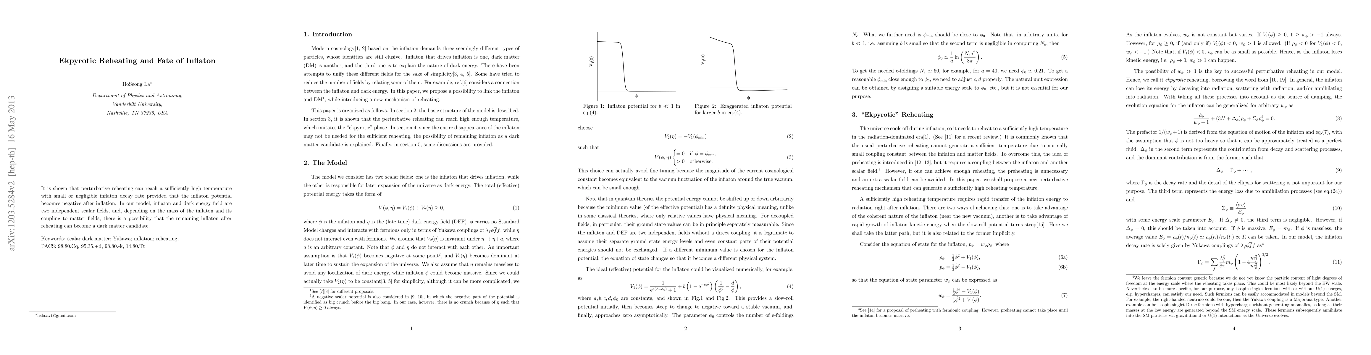 This paper explores ekpyrotic reheating where high temperatures can be achieved with minimal inflaton decay, facilitated by a negative inflaton potential post-inflation. It suggests that leftover inflaton could potentially serve as a dark matter candidate depending on its mass and coupling to matter fields.