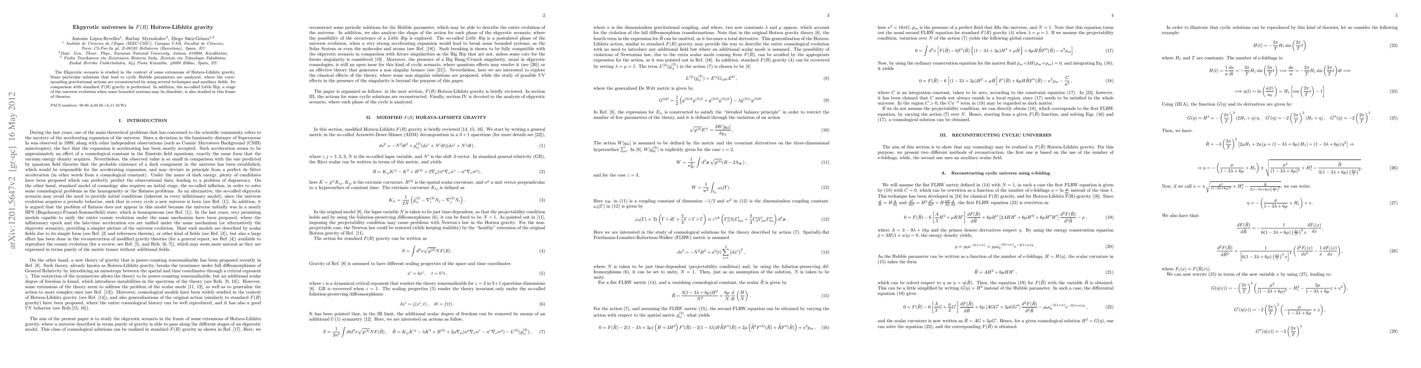 The paper investigates the Ekpyrotic universe model within extended Hořava-Lifshitz gravity, focusing on cyclic Hubble parameters, and reconstructs gravitational actions using various methods. It compares these findings with standard $F(R)$ gravity and explores the Little Rip scenario.