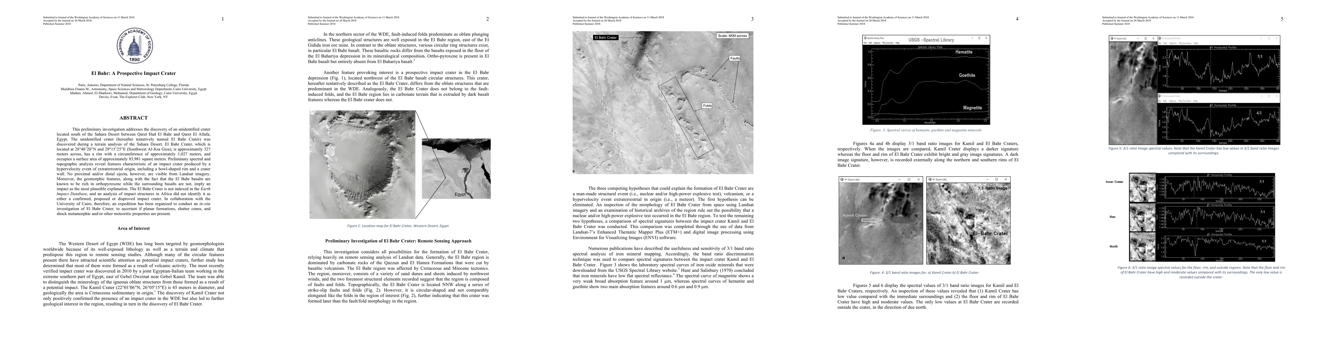 A previously unidentified crater, tentatively named El Bahr Crater, located in Egypt's Sahara Desert shows features consistent with an impact event. It measures 327m across with a rim circumference of 1,027m, lacking ejecta visible from Landsat imagery. The crater's unique basalt composition also supports the impact theory. An in-situ investigation is planned with the University of Cairo to confirm planar formations, shatter cones, and other impact-related features.