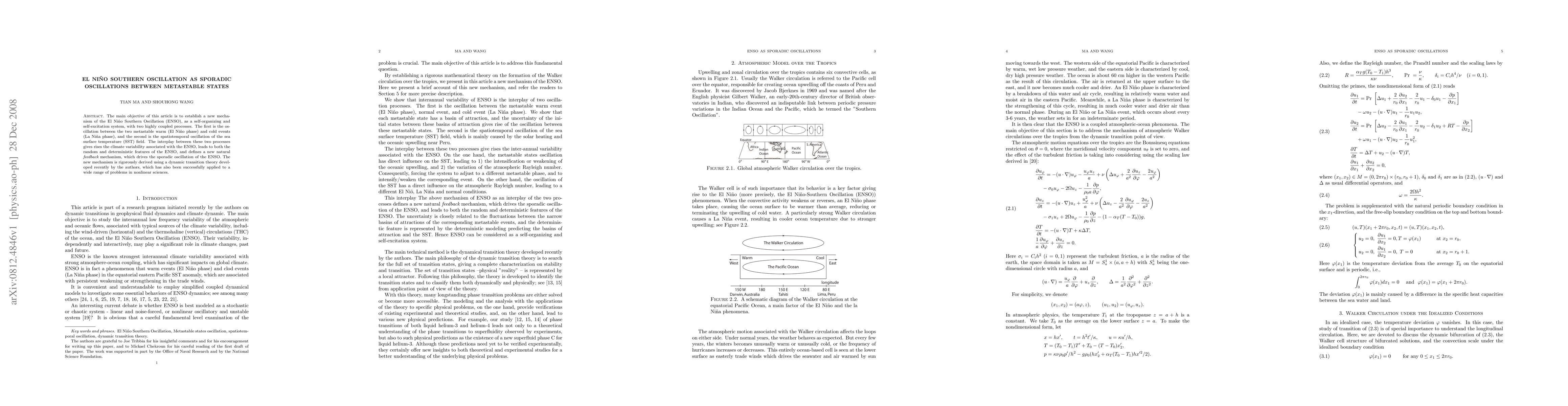 This paper proposes a new mechanism for the El Nino Southern Oscillation (ENSO) as a self-organizing system characterized by oscillations between metastable warm and cold phases, driven by a dynamic transition theory. The interplay between these oscillations and spatiotemporal sea surface temperature variations defines the climate variability and sporadic nature of ENSO.