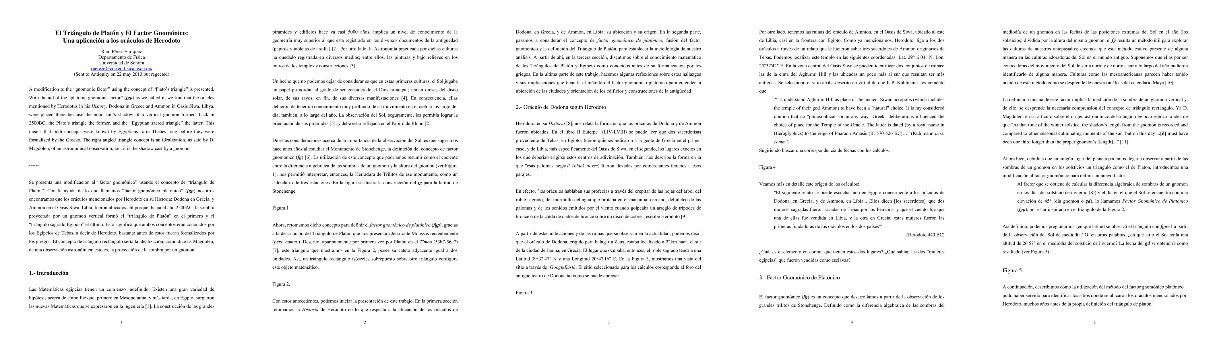 A modification to the gnomonic factor using the concept of triangle of Plato is presented. With the aid of the platonic gnomonic factor (fgp) as we called it, we find that the oracles mentioned by Herodotus in his History, Dodona in Greece and Ammon in Oasis Siwa, Libya, were placed there because the noon shadow of Sun of a gnomon formed, back in 2500BC, the triangle of Plato the former, and the Egyptian sacred triangle the latter. This means that both concepts were known by Egyptians form Thebes long before they were formalized by the Greeks. The right angled triangle concept is an idealization, as said by D. Magdolen, of an astronomical observation; i. e. it is the shadow cast by a gnomon. ----- Se presenta una modificacion al factor gnomonico usando el concepto de triangulo de Platon. Con la ayuda de lo que llamamos factor gnomonico platonico (fgp) nosotros encontramos que los oraculos mencionados por Herodoto en su Historia, Dodona en Grecia, y Ammon en el Oasis Siwa, Libia, fueron ubicados ahi porque, hacia el anio 2500AC, la sombra proyectada por un gnomon vertical formo el triangulo de Platon en el primero y el triangulo sagrado Egipcio el ultimo. Esto significa que ambos conceptos eran conocidos por los Egipcios de Tebas, a decir de Herodoto, bastante antes de estos fueran formalizados por los griegos. El concepto de triangulo rectangulo seria la idealizacion, como dice D. Magdolen, de una observacion astronomica; esto es, la proyeccion de la sombra por un gnomon.