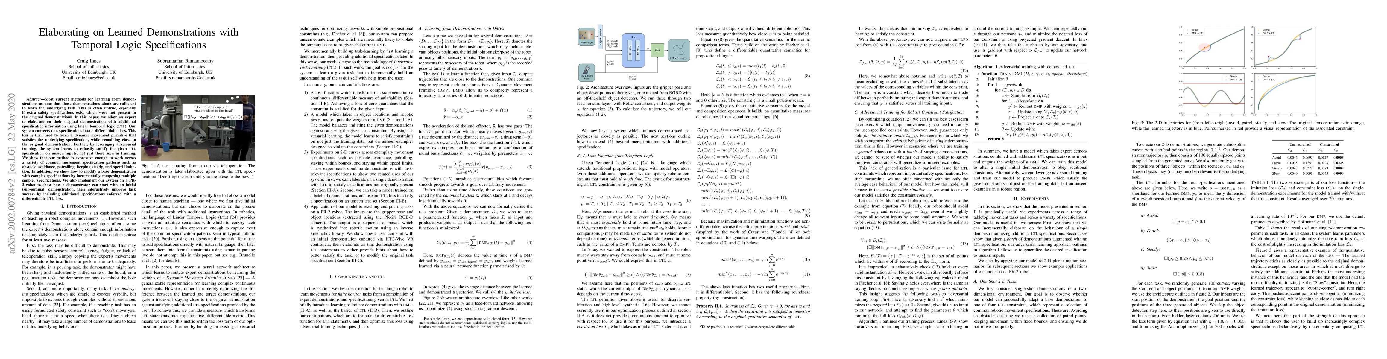 This paper proposes a method for enhancing learned demonstrations using linear temporal logic (LTL) specifications, converting LTL into a differentiable loss to refine dynamic movement primitives. The system leverages adversarial training to robustly satisfy specifications on unseen inputs, demonstrating effectiveness across various movement patterns and showcasing its application on a PR-2 robot.