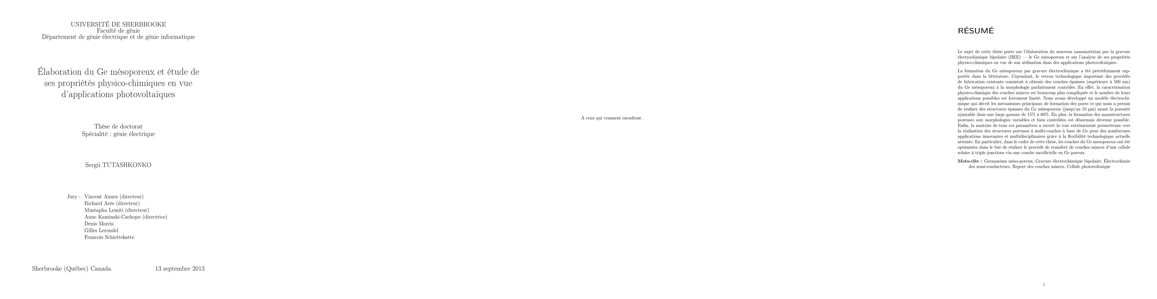 Development of the new nanomaterial - the mesoporous Ge - by bipolar electrochemical etching (BEE) and analysis of its physico-chemical properties is the subject of this thesis. Formation of mesoporous Ge by electrochemical etching was previously reported in the literature. However, up to now, realization of thick (above 500 nm) mesoporous Ge layers with perfectly controlled morphology has been an issue. Indeed, the physico-chemical characterization of thin layers is much more complicated and the number of possible applications is very limited. We have developed an electrochemical model that describes the principal mechanisms of the pore formation which allowed us to produce the thick (up to 10 um) mesoporous Ge structures with the porosity adjustable in the range of 15% to 60% In addition, the formation of porous nanostructures with well-controlled variable morphologies has now become possible. Finally, the mastery of these parameters has opened the extremely promising path towards realization of porous multilayer structures based on Ge for many innovative and multidisciplinary applications. In particular, in the context of this thesis, the mesoporous layers of Ge were optimized for performing a layer transfer process of a triple-junction solar cell via a sacrificial layer of porous Ge. Keywords: mesoporous Germanium, bipolar electrochemical etching, electrochemistry of semiconductors, layer transfer process, solar cells.