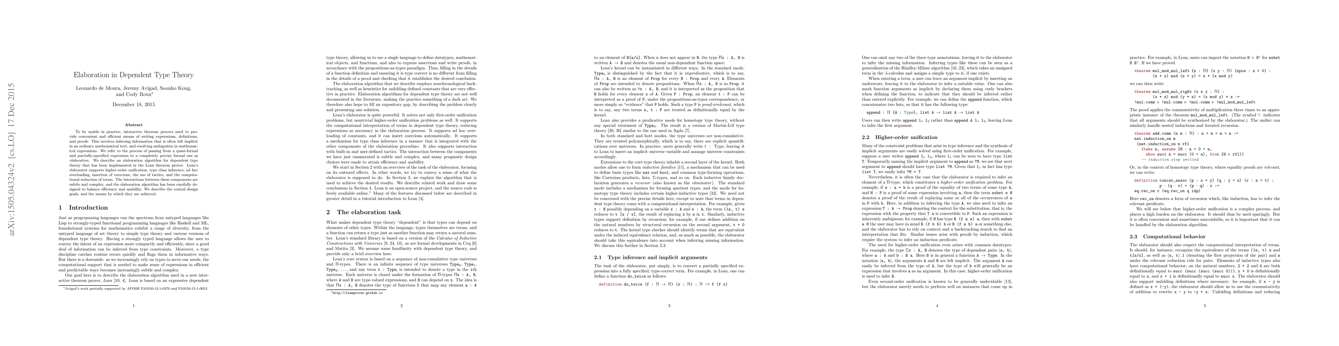 To be usable in practice, interactive theorem provers need to provide convenient and efficient means of writing expressions, definitions, and proofs. This involves inferring information that is often left implicit in an ordinary mathematical text, and resolving ambiguities in mathematical expressions. We refer to the process of passing from a quasi-formal and partially-specified expression to a completely precise formal one as elaboration. We describe an elaboration algorithm for dependent type theory that has been implemented in the Lean theorem prover. Lean's elaborator supports higher-order unification, type class inference, ad hoc overloading, insertion of coercions, the use of tactics, and the computational reduction of terms. The interactions between these components are subtle and complex, and the elaboration algorithm has been carefully designed to balance efficiency and usability. We describe the central design goals, and the means by which they are achieved.