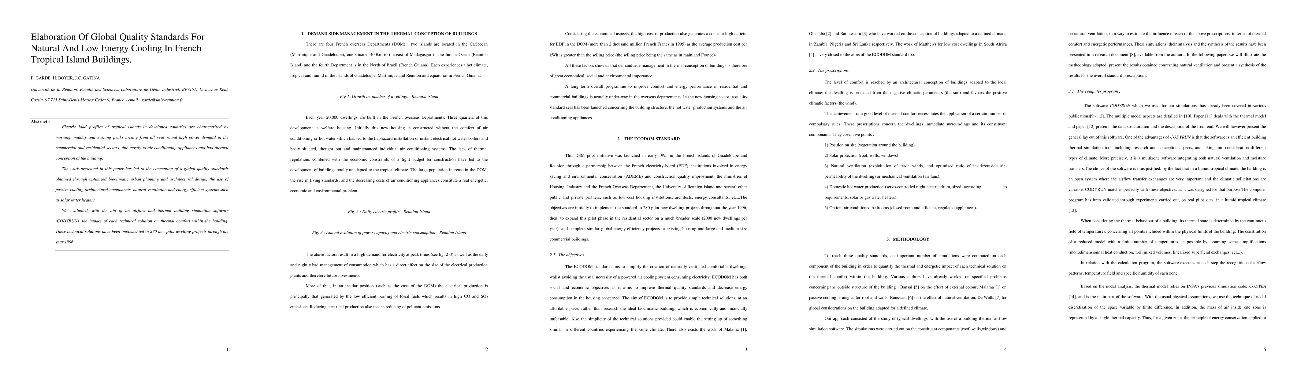 This paper develops global quality standards for natural and low-energy cooling in French tropical island buildings, utilizing optimized bioclimatic planning, passive cooling components, and energy-efficient systems to reduce high year-round power demand. The effectiveness of these solutions was evaluated using simulation software and implemented in 280 pilot projects.