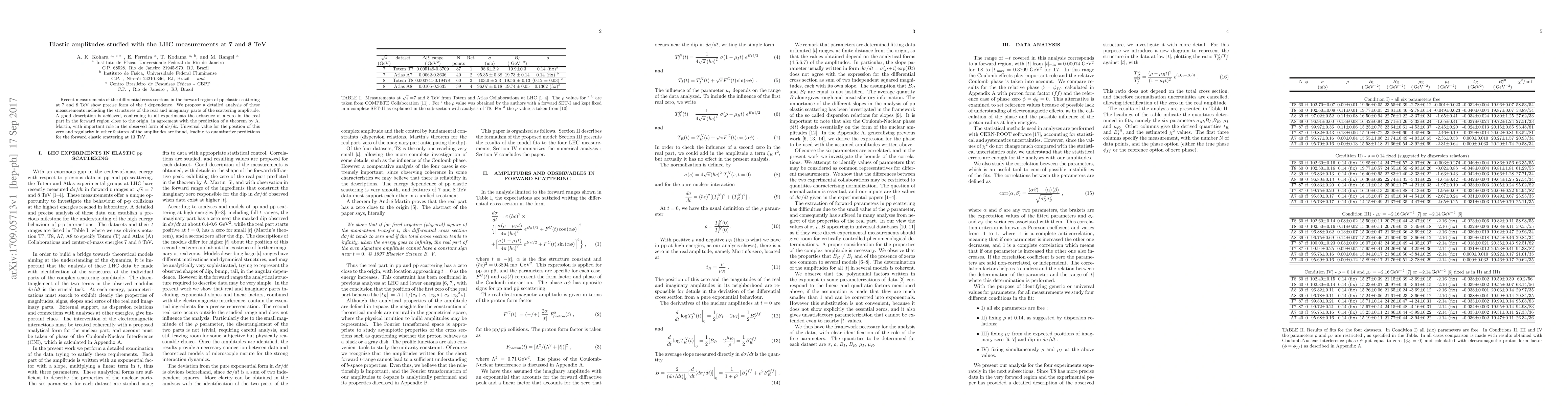 Researchers analyzed LHC measurements to study elastic scattering at 7 and 8 TeV, finding a zero in the real part of the scattering amplitude near the origin and universal values for other features.