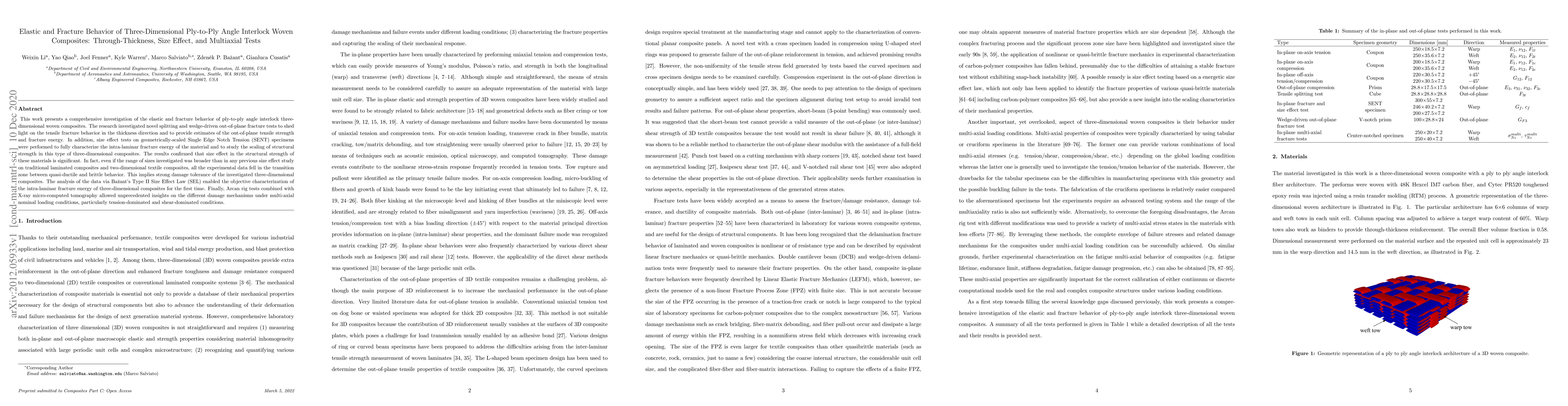 This paper investigates the elastic and fracture behavior of three-dimensional ply-to-ply angle interlock woven composites using novel fracture tests and size effect studies, revealing significant size effects and strong damage tolerance. The analysis provides new insights into intra-laminar fracture energy and multiaxial damage mechanisms.