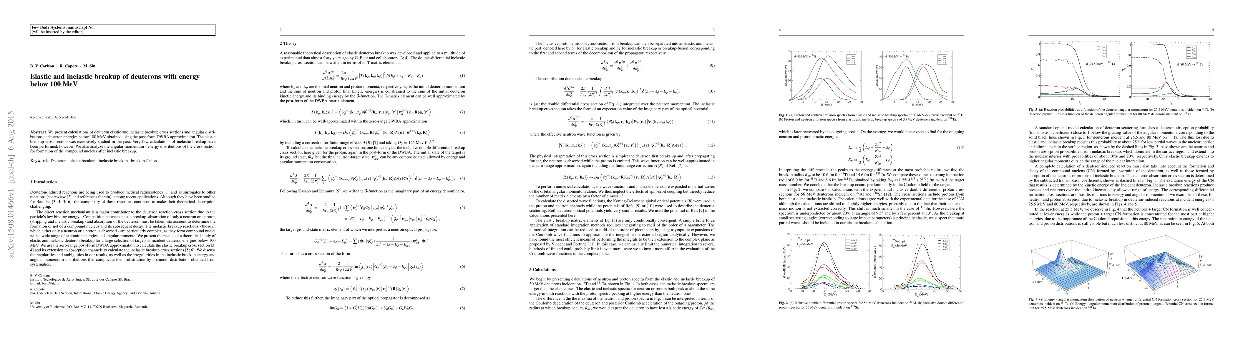 We present calculations of deuteron elastic and inelastic breakup cross sections and angular distributions at deuteron energies below 100 MeV obtained using the post-form DWBA approximation. The elastic breakup cross section was extensively studied in the past. Very few calculations of inelastic breakup have been performed, however. We also analyze the angular momentum - energy distributions of the cross section for formation of the compound nucleus after inelastic breakup.
