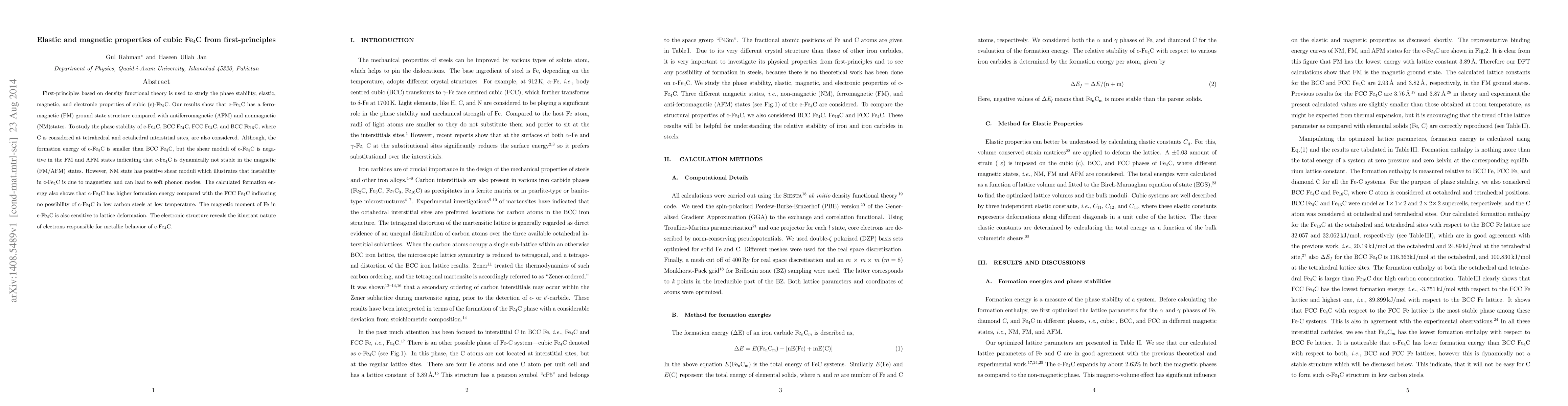 First-principles based on density functional theory is used to study the phase stability, elastic, magnetic, and electronic properties of cubic (c)-Fe$_4$C. Our results show that c-Fe$_{4}$C has a ferromagnetic (FM) ground state structure compared with antiferromagnetic (AFM) and nonmagnetic (NM)states. To study the phase stability of c-Fe$_4$C, BCC Fe$_4$C, FCC Fe$_4$C, and BCC Fe$_{16}$C, where C is considered at tetrahedral and octahedral interstitial sites, are also considered. Although, the formation energy of c-Fe$_4$C is smaller than BCC Fe$_4$C, but the shear moduli of c-Fe$_4$C is negative in the FM and AFM states indicating that c-Fe$_4$C is dynamically not stable in the magnetic (FM/AFM) states. However, NM state has positive shear moduli which illustrates that instability in c-Fe$_4$C is due to magnetism and can lead to soft phonon modes. The calculated formation energy also shows that c-Fe$_4$C has higher formation energy compared with the FCC Fe$_4$C indicating no possibility of c-Fe$_4$C in low carbon steels at low temperature. The magnetic moment of Fe in c-Fe$_4$C is also sensitive to lattice deformation. The electronic structure reveals the itinerant nature of electrons responsible for metallic behavior of c-Fe$_4$C.