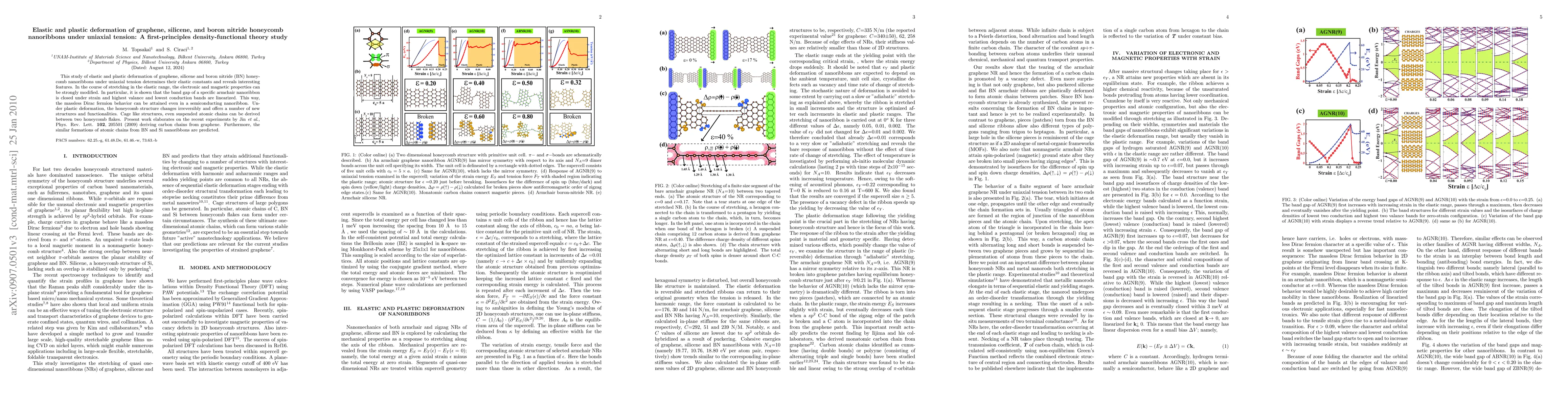 This research uses first-principles density-functional theory to explore the elastic and plastic deformation of graphene, silicene, and boron nitride nanoribbons under tension, finding that strain can close the band gap and linearize bands, allowing Dirac fermion behavior. Plastic deformation leads to irreversible structural changes, forming cagelike structures and atomic chains.