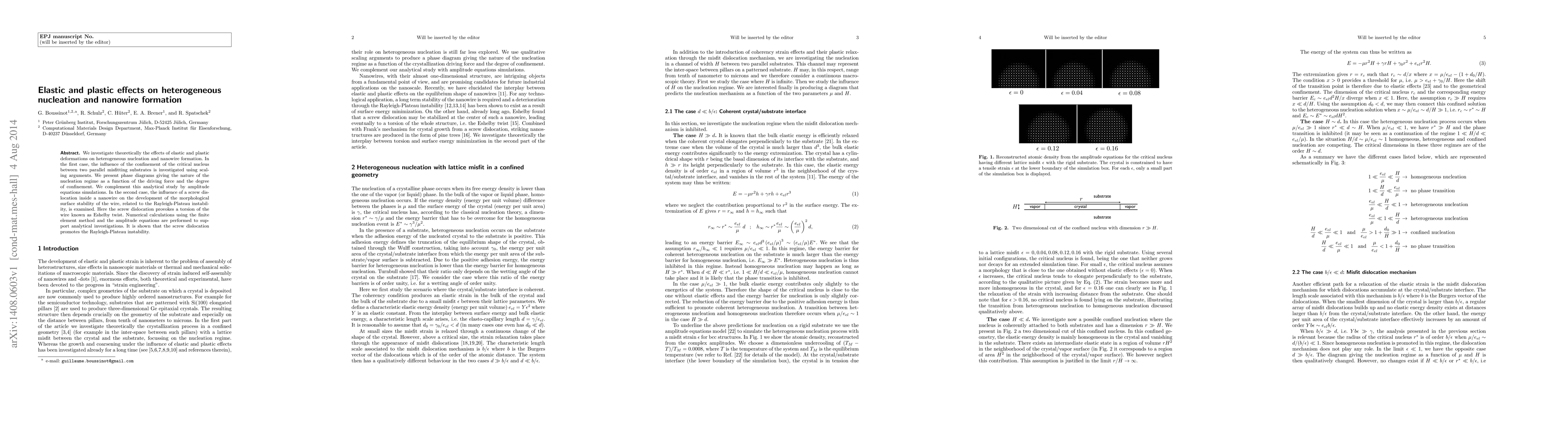This paper theoretically explores how elastic and plastic deformations affect heterogeneous nucleation and nanowire formation. It uses scaling arguments and simulations to analyze the influence of substrate confinement on nucleation and investigates the impact of screw dislocations on the Rayleigh-Plateau instability and Eshelby twist in nanowires.