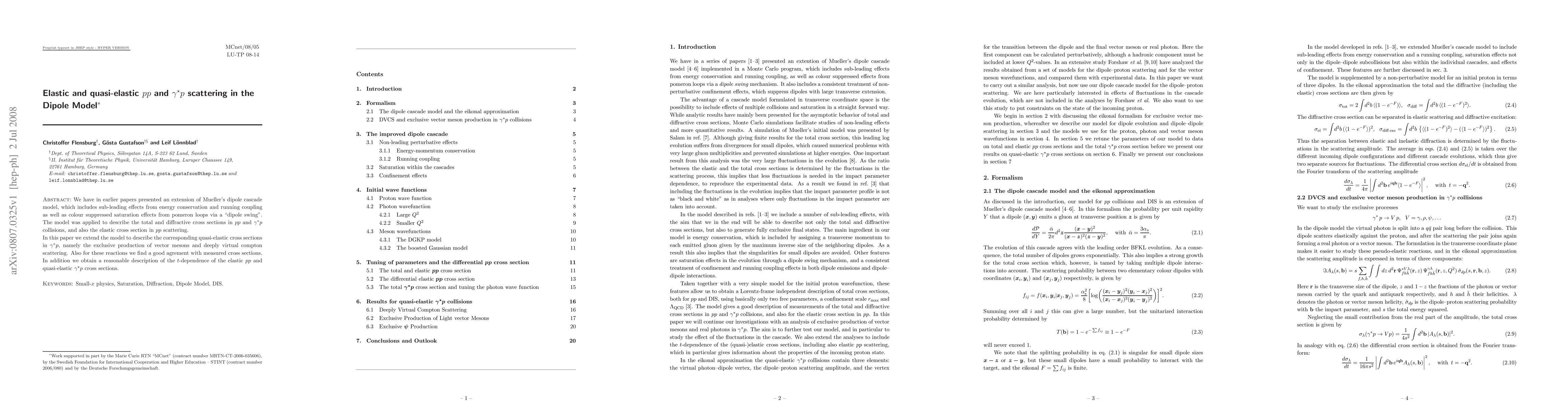 This paper extends Mueller's dipole cascade model to include quasi-elastic cross sections in $\gamma^*p$ collisions, describing exclusive vector meson production and deeply virtual Compton scattering. The model also provides a good fit to measured cross sections and a reasonable description of the $t$-dependence in elastic $pp$ and quasi-elastic $\gamma^*p$ scattering.