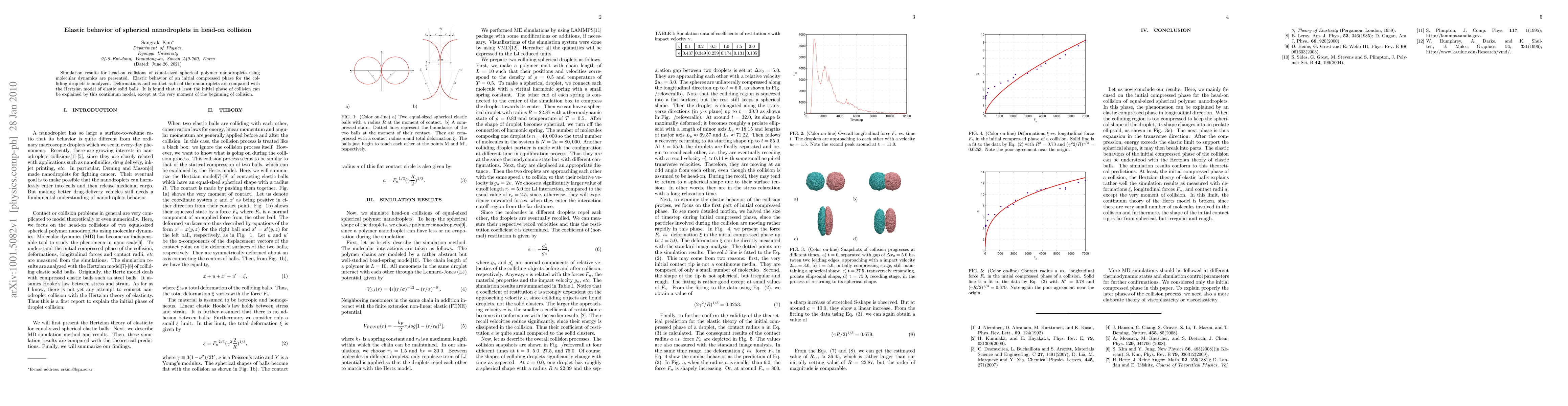 Summary: Molecular dynamics simulations reveal the elastic behavior of colliding spherical polymer nanodroplets, showing initial deformations align with the Hertzian model for elastic solids, except at the precise start of the collision.