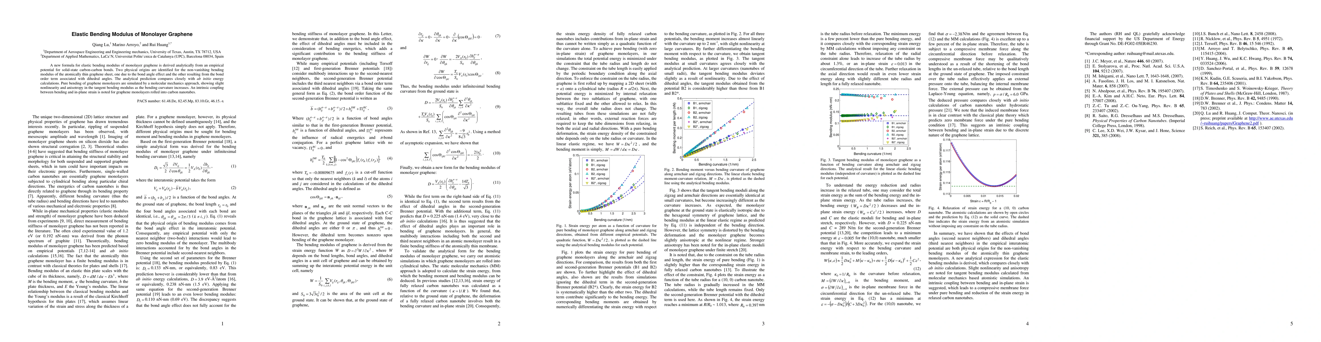 This paper derives an analytical formula for the elastic bending modulus of monolayer graphene, identifying bond angle and bond order effects as its physical origins. Simulation results show slight nonlinearity and anisotropy in bending modulus, with an intrinsic coupling between bending and in-plane strain in rolled graphene.