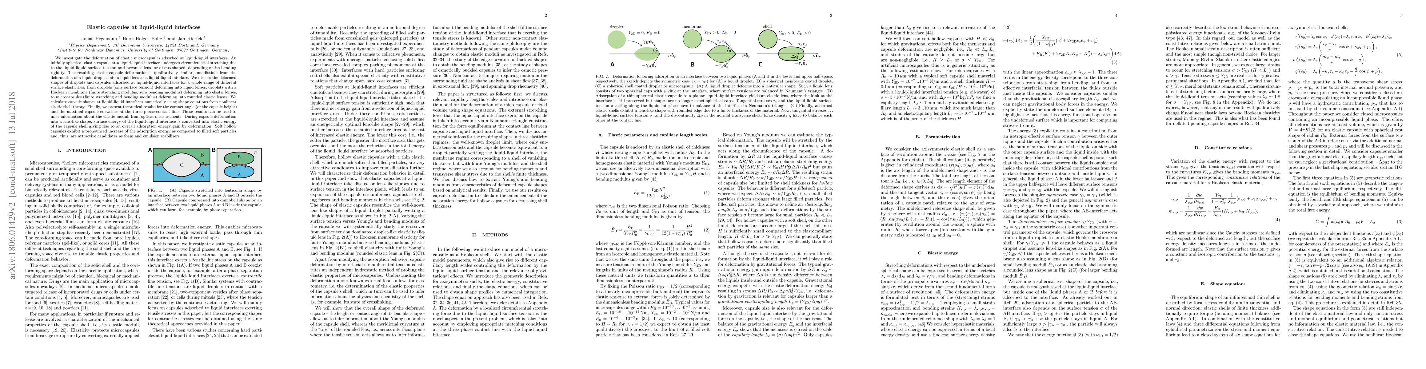 This paper investigates the deformation of elastic microcapsules at liquid-liquid interfaces, where they transform from spherical to lens-shaped due to surface tension, with their deformation dependent on bending rigidity. Theoretical calculations based on nonlinear elastic shell theory predict capsule shapes and provide insights into elastic moduli, revealing that deformed capsules can significantly enhance adsorption energy, making them effective stabilizers for foams and emulsions.